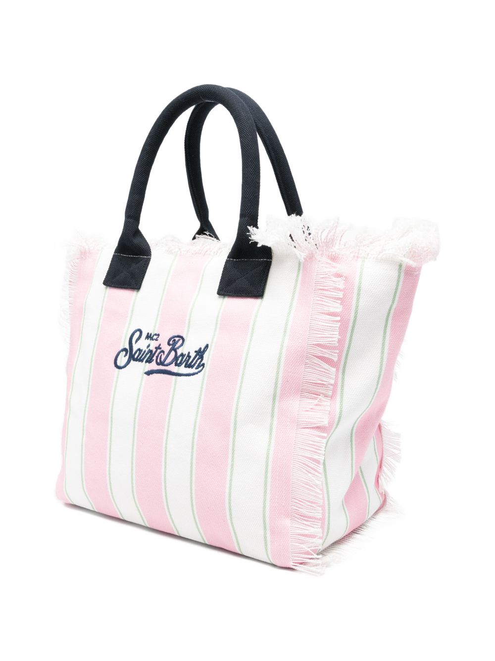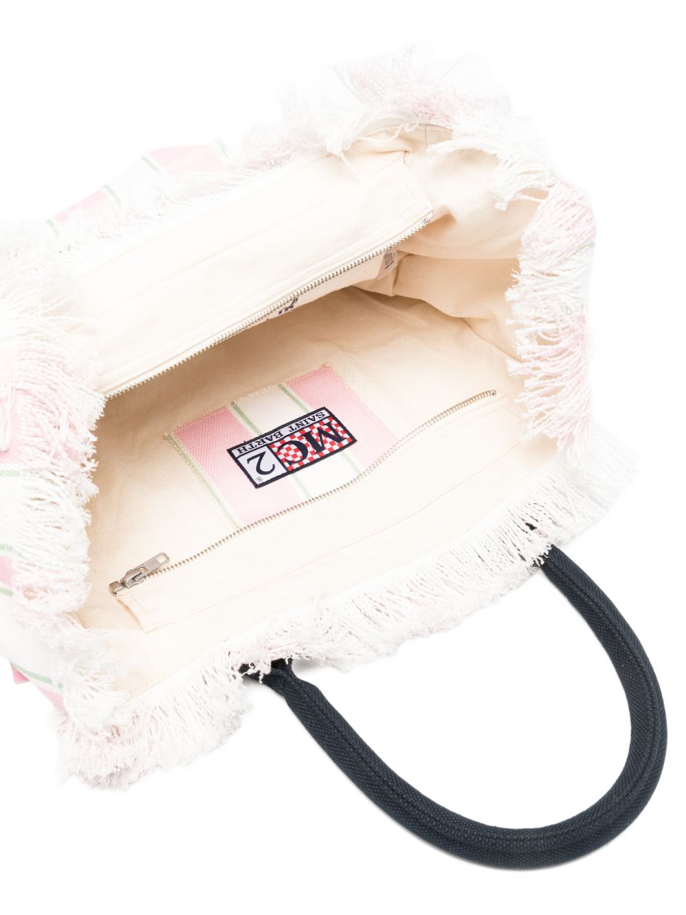 Realizzata in cotone, doppio manico superiore, stampa logo davanti, chiusura superiore e tasca interna con zip, dettaglio frange, 40 x 32 x 20 cm, 100% cotone