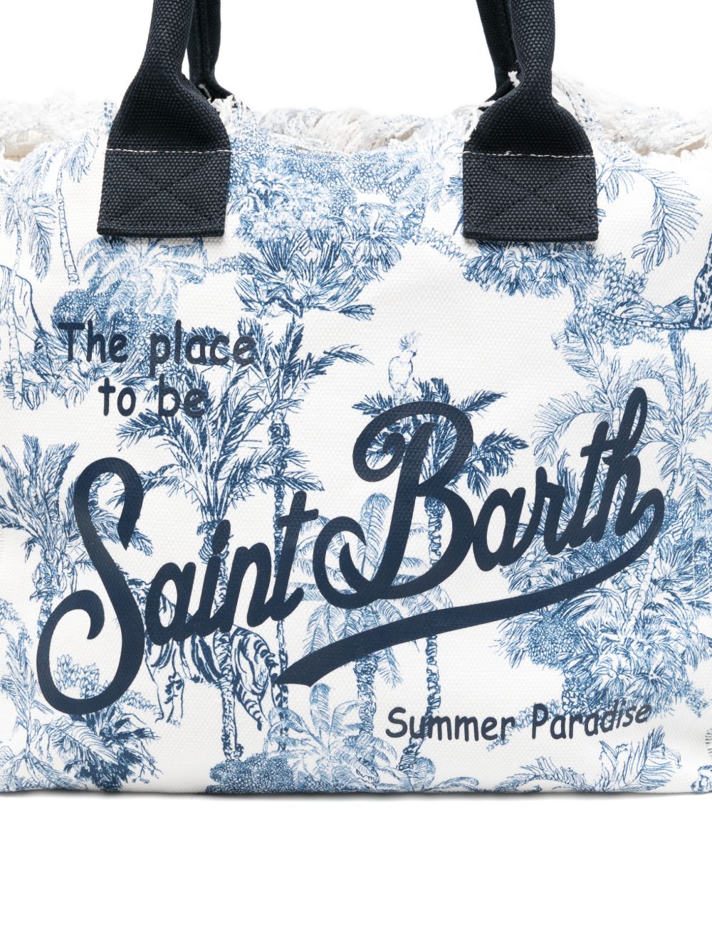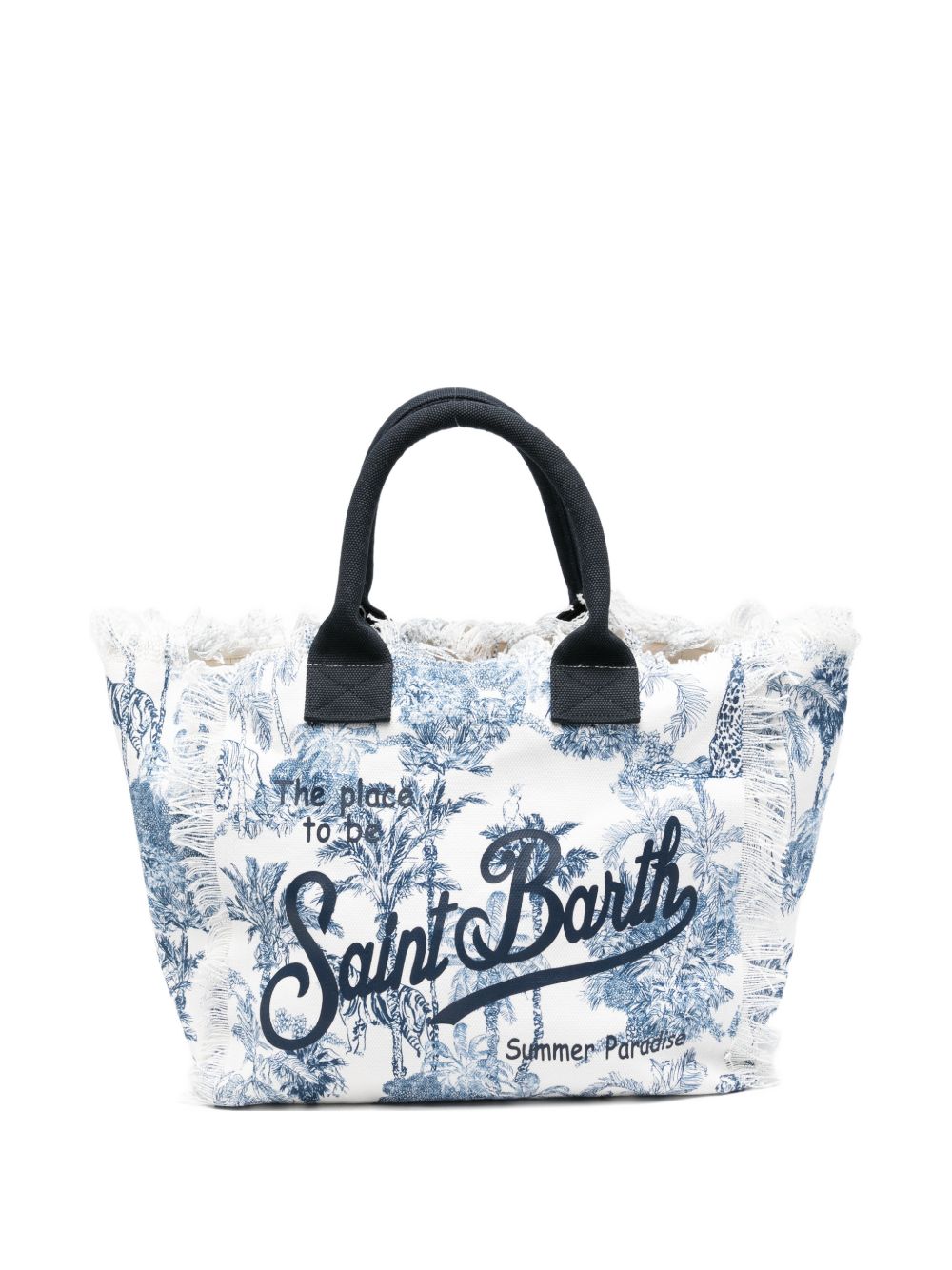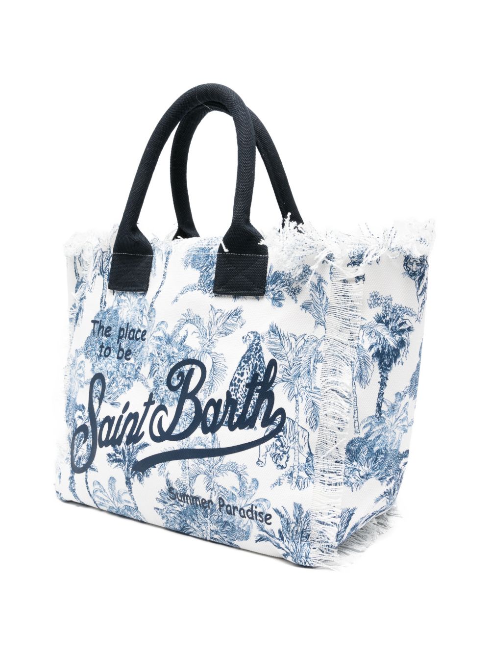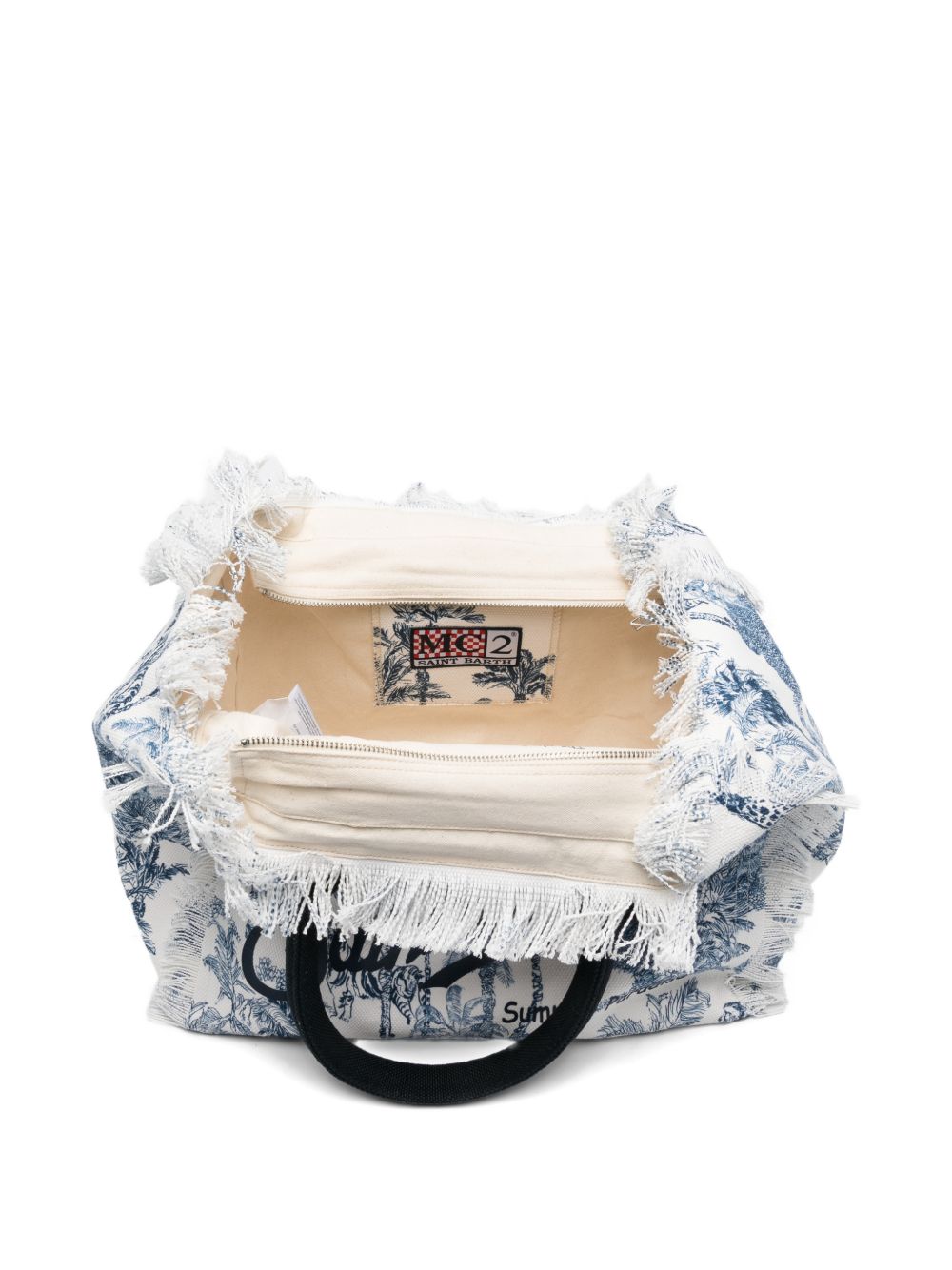 Realizzata in cotone, doppio manico superiore, stampa logo davanti, chiusura superiore e tasca interna con zip, dettaglio frange, 40 x 32 x 20 cm, 100% cotone
