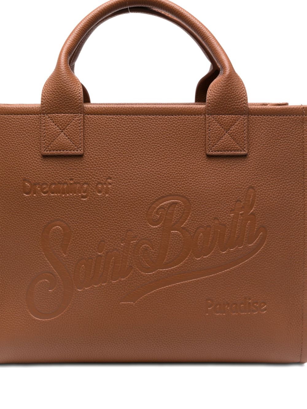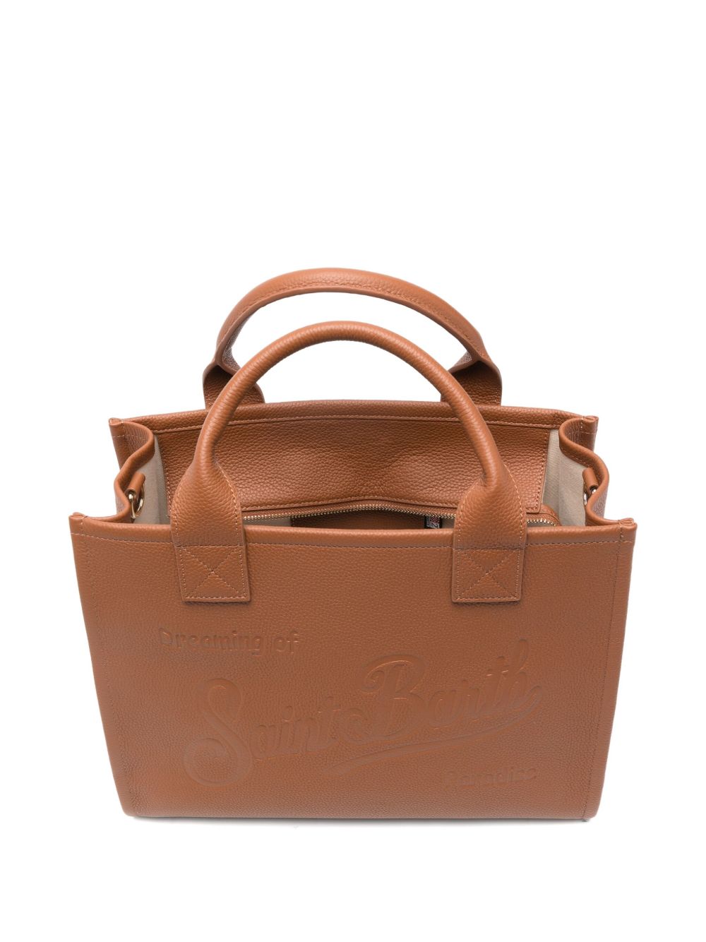 realizzata in pelle martellata color marrone cammello, logo impresso a caldo, doppio manico, tracolla removibile, larghezza 35 cm, altezza 27 cm, profondità 15 cm