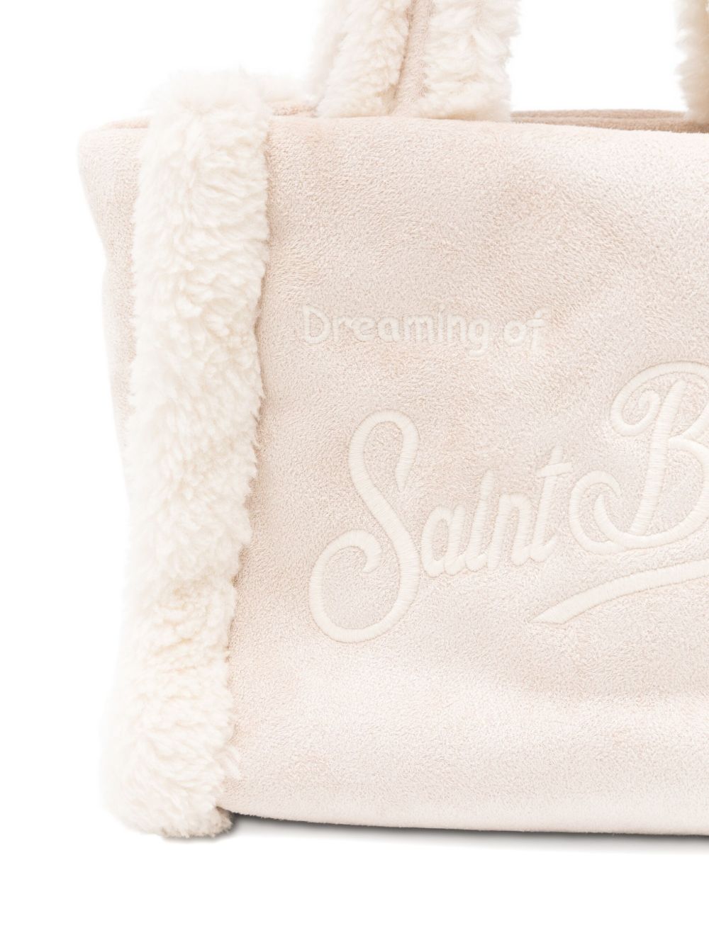 realizzata in tessuto effetto montone, logo ricamato, doppio manico, chiusura superiore con bottone a pressione, tracolla removibile, tasca interna copn zip, larghezza 25 cm, altezza 23 cm, profondità 10 cm