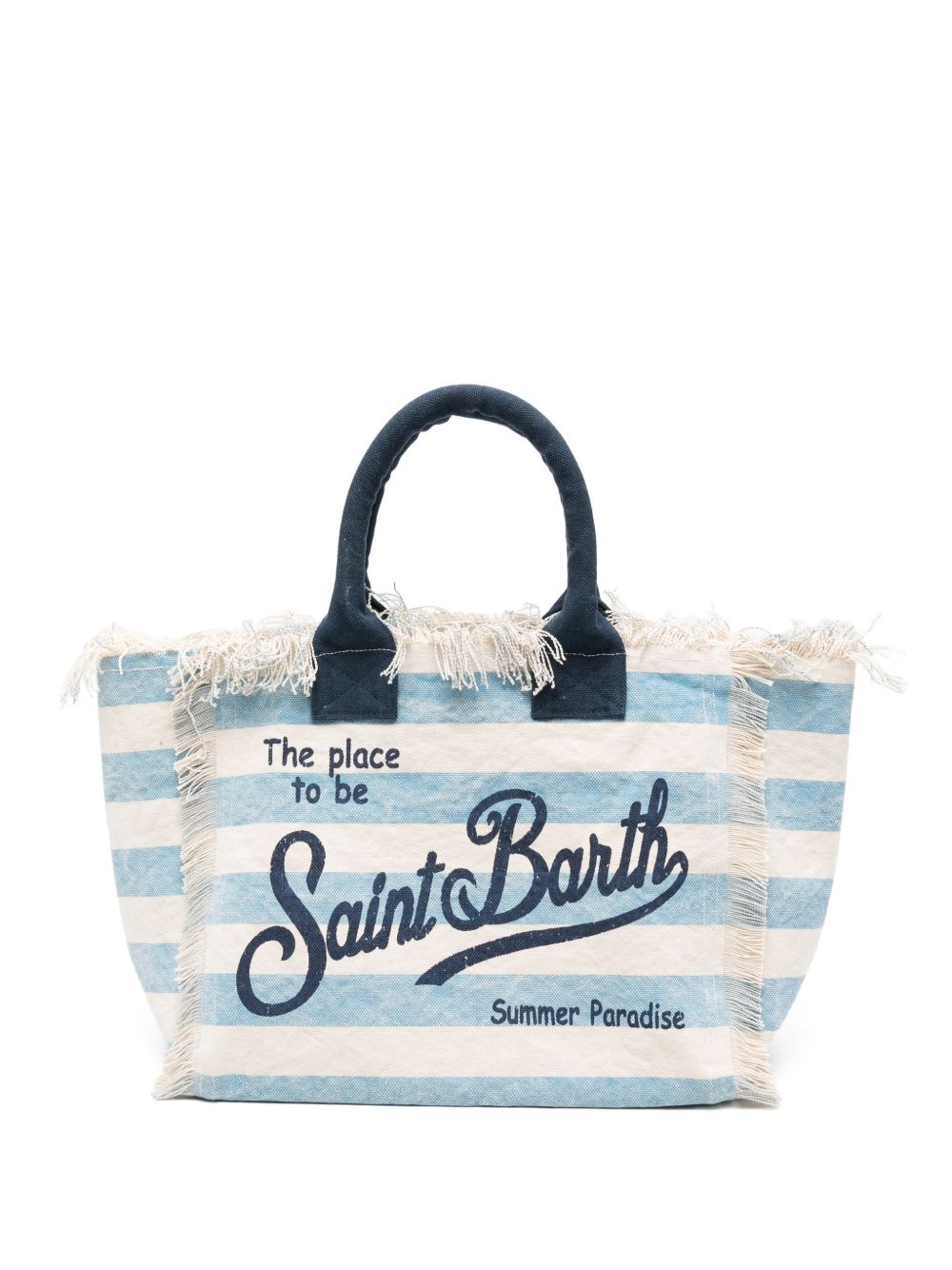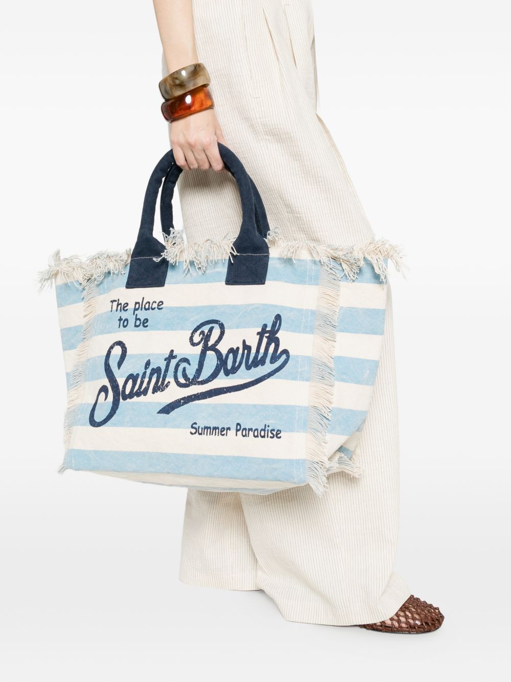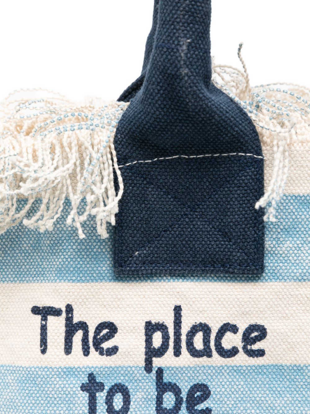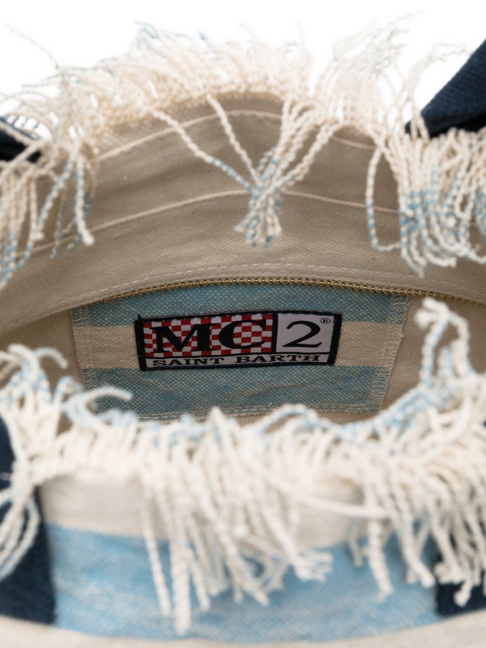 Realizzata in cotone, doppio manico superiore, stampa logo davanti, chiusura superiore e tasca interna con zip, dettaglio frange, 40 x 32 x 20 cm, 100% cotone