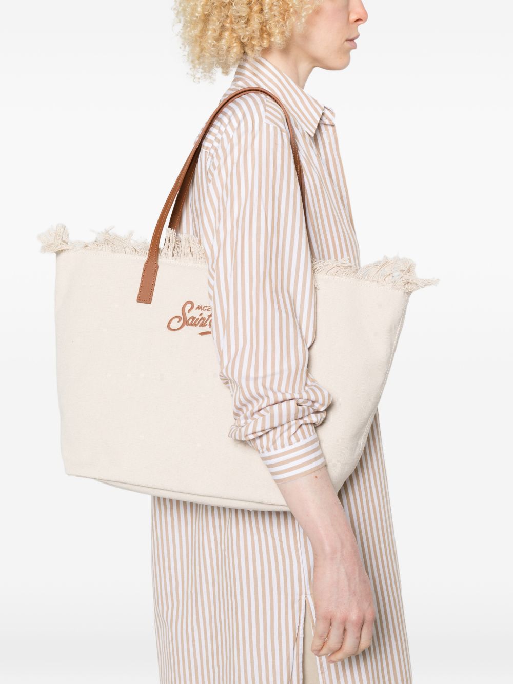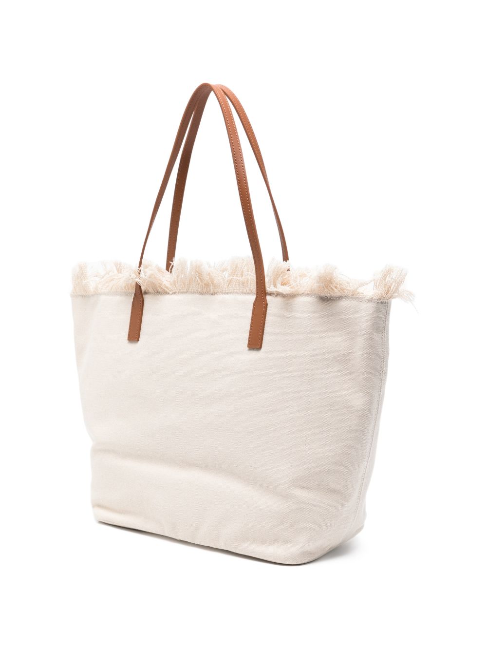 Realizzata in cotone, logo ricamato davanti, doppio manico, chiusura superiore e tasca interna con zip, dettaglio frange, larghezza 45 cm, altezza 30 cm, profondità 16 cm, manico 25 cm.