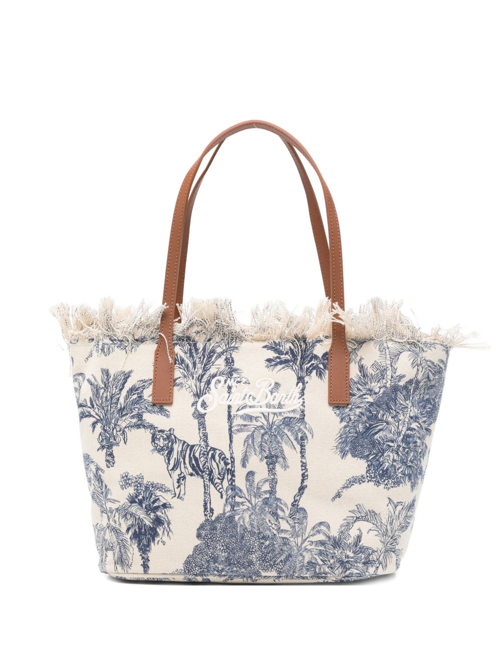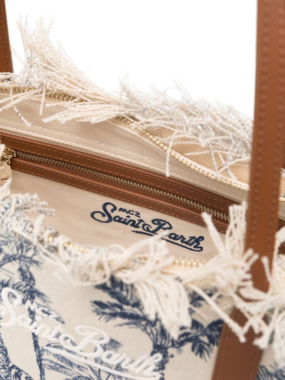 Realizzata in cotone, logo ricamato davanti, doppio manico, chiusura superiore e tasca interna con zip, dettaglio frange, stampa palme, 44 x 22,5 x 12 cm.