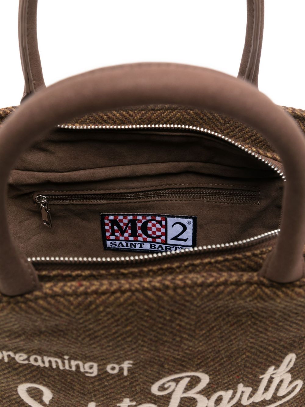 realizzata in tessuto misto lana, manici in faux suede, logo ricamato sul davanti, tracolla regolabile e removibile, tasca interna, dettaglio frange, lunghezza 27 cm, altezza 25 cm, profondità 14 cm, 20% lana, 70% poliestere
