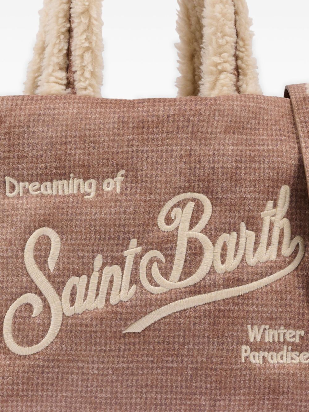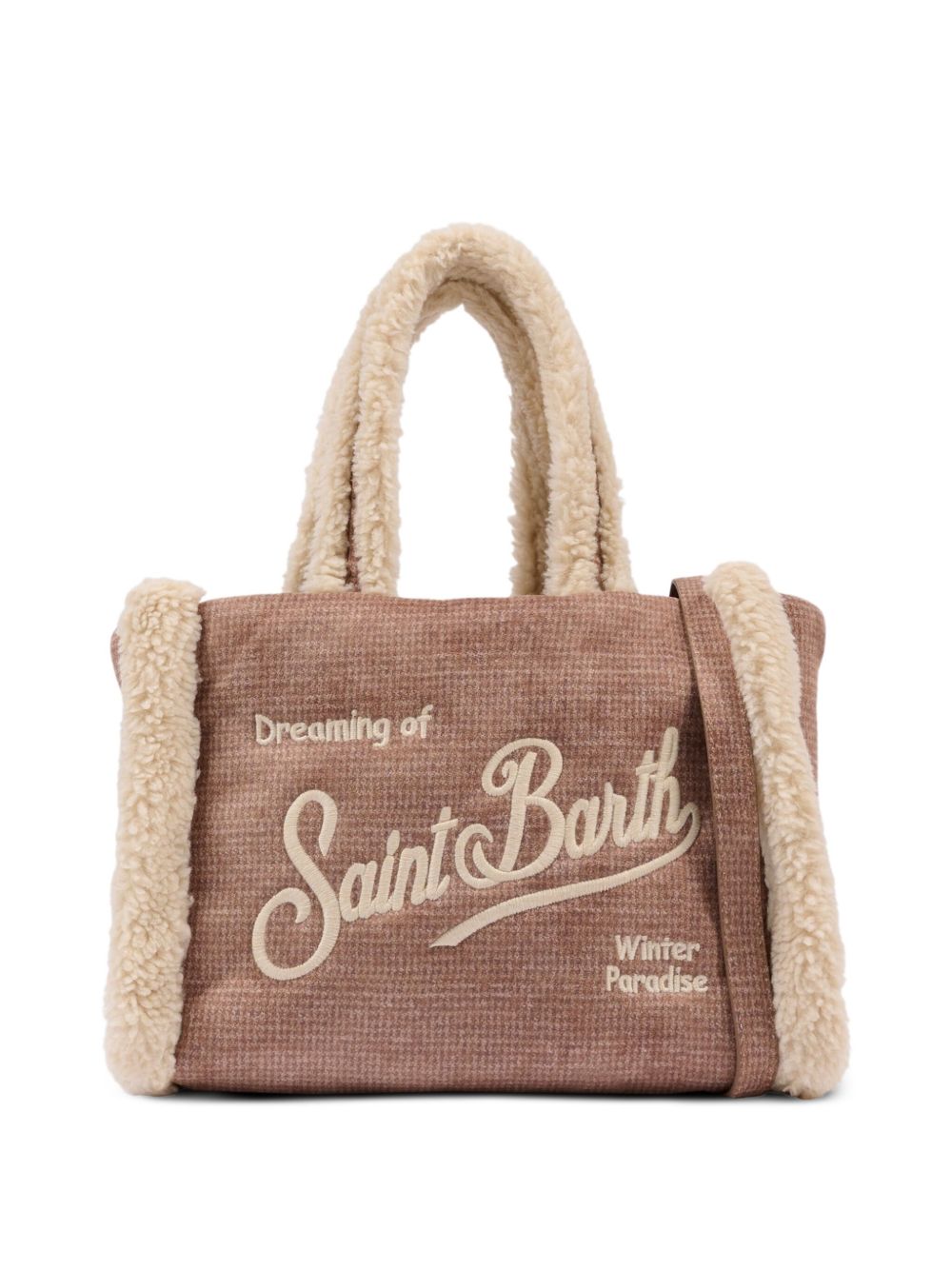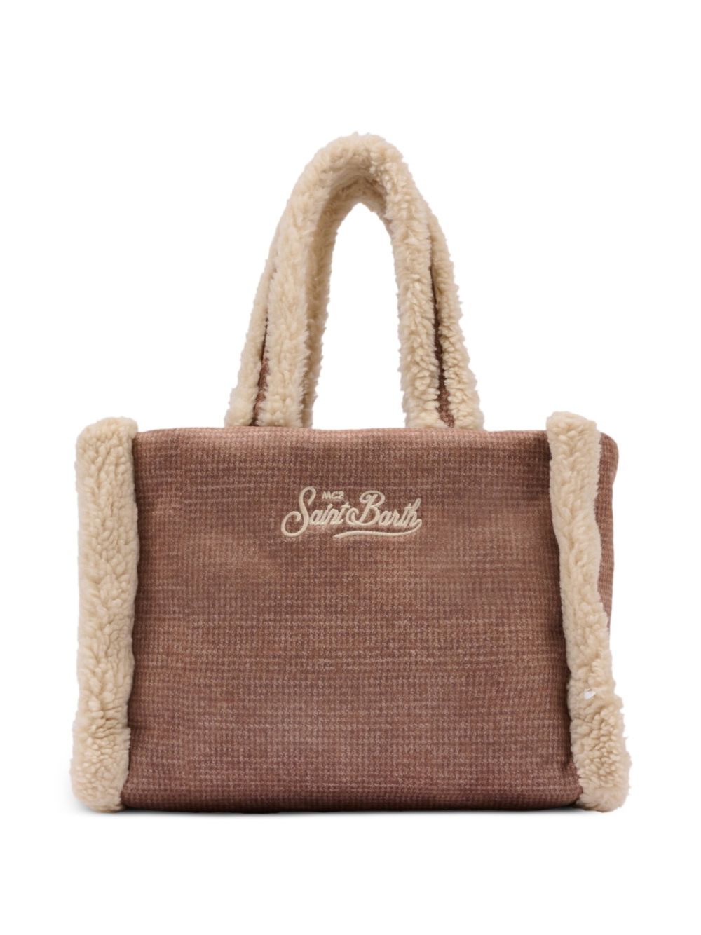 realizzata in morbido tessuto effetto shearling motivo pied de poule, logo ricamato sul davanti, doppio manico, tracolla regolabile e removibile, tasca interna a parete con zip, lunghezza 32 cm, altezza 24 cm, profondità 12 cm, 100% poliestere