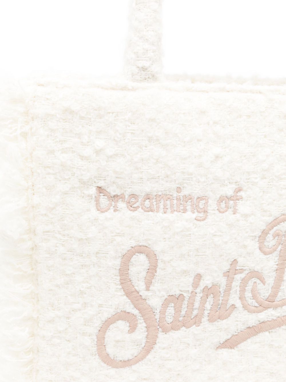 realizzata in misto lana bianca, logo ricamato, tessuto tweed, tracolla regolabile e removibile, chiusura superiore con zip, tasca interna, larghezza 25 cm, lunghezza 27 cm, profondità 14 cm, 70% poliestere, 30% lana
