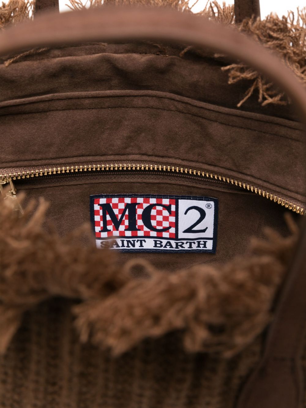 realizzata in tessuto effetto lana, dettaglio logo ricamato frontale, bordo con frange, scomparto unico, tasca a parete, chiusura superiore con zip, tracolla removibile, larghezza 35 cm, altezza 25 cm, profondità 10 cm, manico 10 cm, tracolla 45 cm, 100% acrilico 100% poliestere