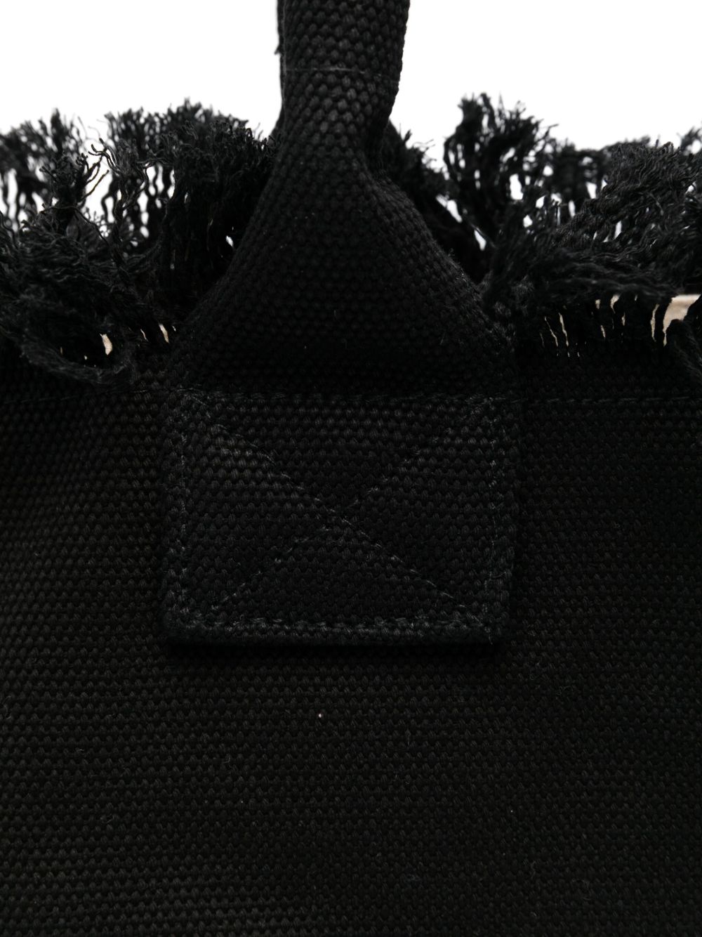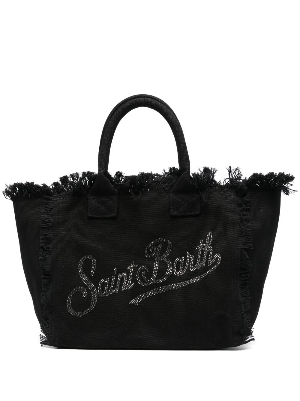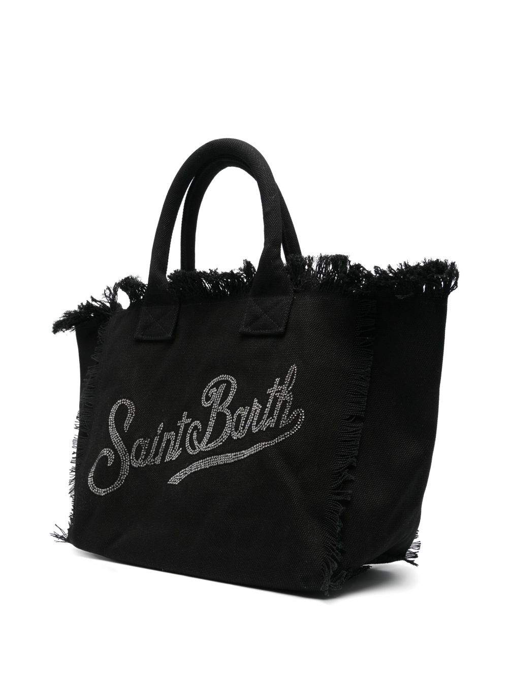 realizzata in tessuto canvas, logo sul davanti con strass, bordi sfrangiati, manico doppio, chiusura superiore parziale con zip, tasca interna, lunghezza 40 cm, altezza 32 cm, profondità 20 cm