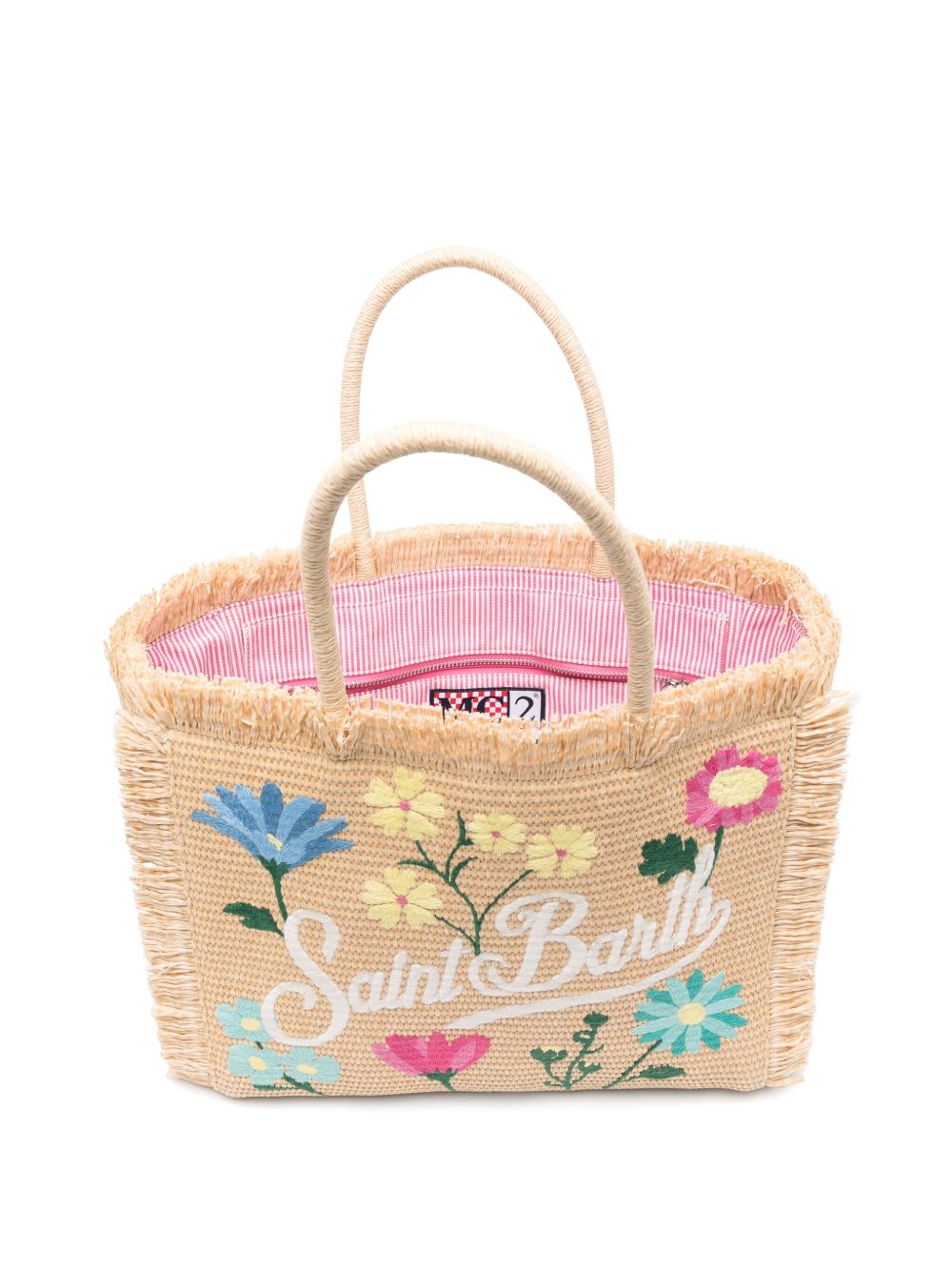 realizzata in tessuto effetto rafia, logo e fiori ricamati sul davanti, doppio manico, bordi sfrangiati, interno foderato in cotone, tasca interna con zip, lunghezza 28 cm, altezza 25 cm, profondità 14 cm, manico 15 cm, 55% polipropilene, 45% cotone