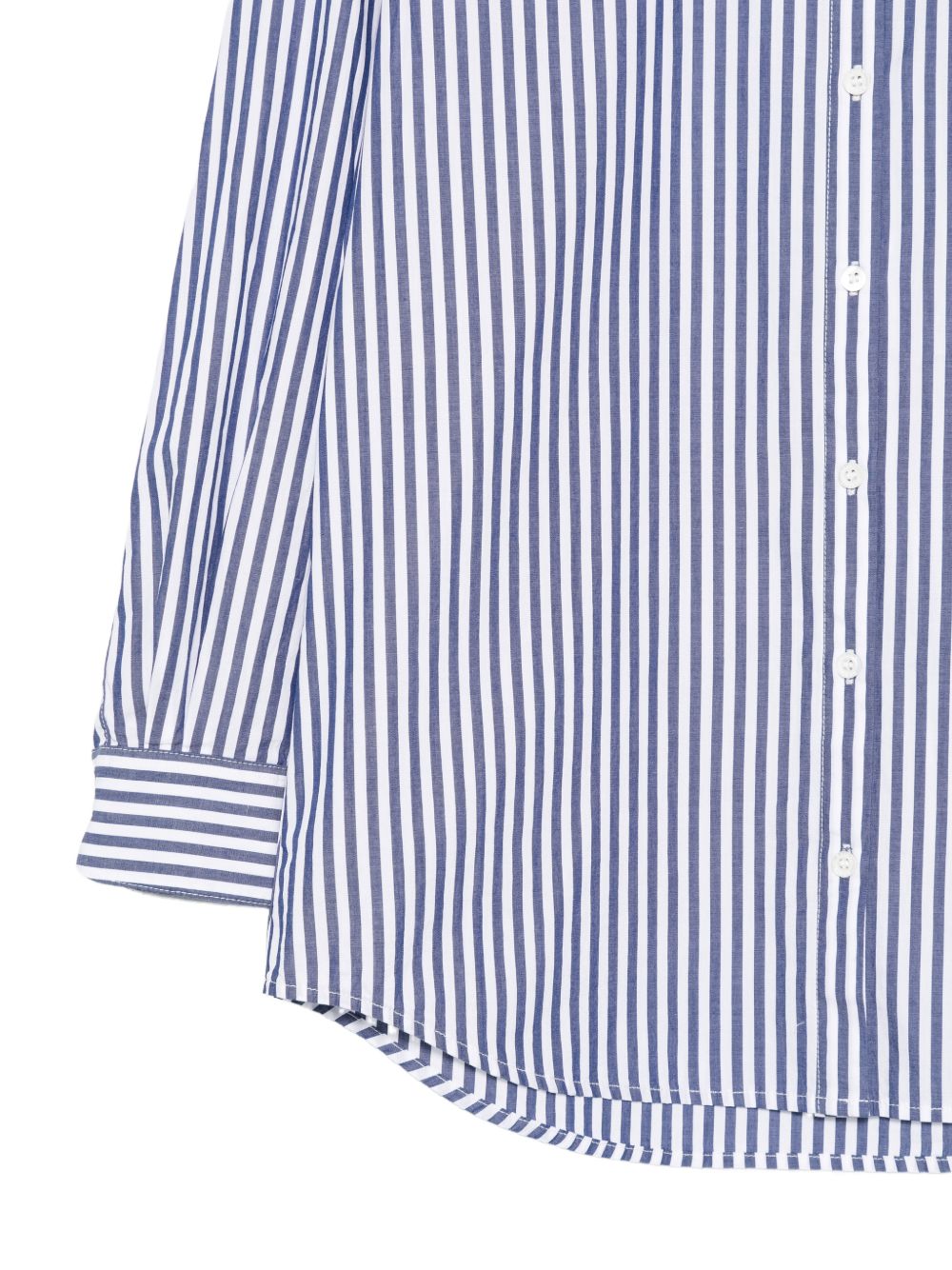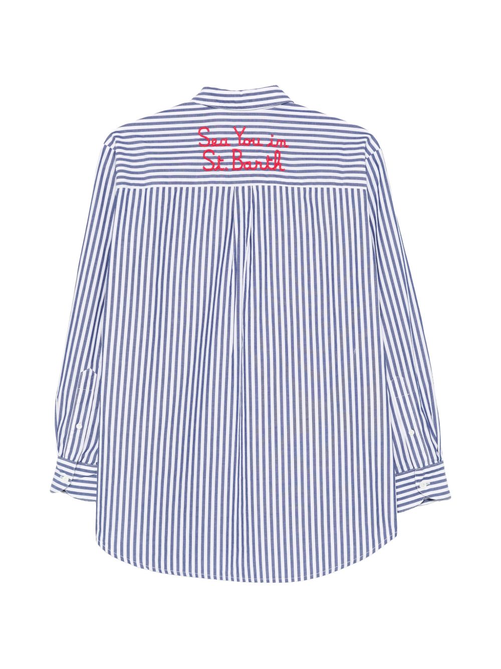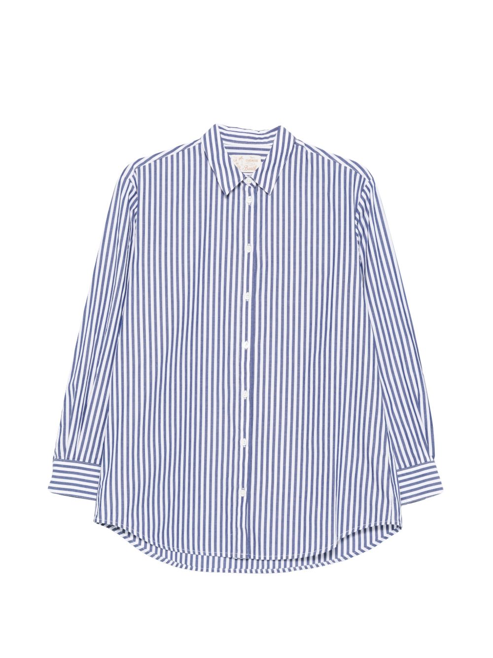 Realizzata in cotone, trama a righe blu all-over, maniche lunghe, chiusura con abbottonatura, colletto classico camicia, logo con scritta ricamata dietro, 100% cotone