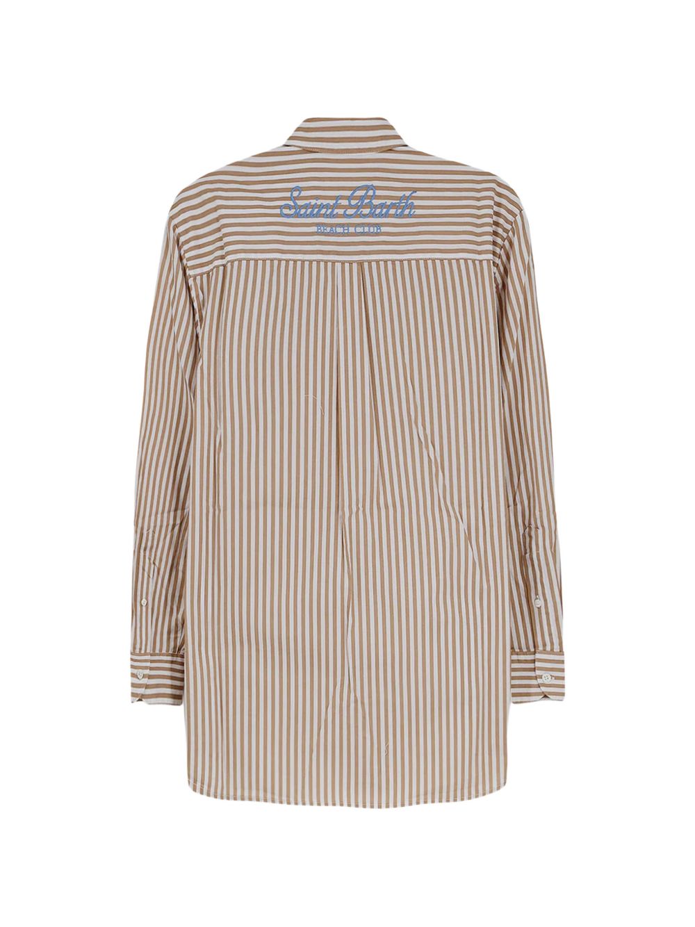 Realizzata in cotone, trama a righe marroni all-over, maniche lunghe, chiusura con abbottonatura, colletto classico camicia, logo con scritta ricamata dietro, 100% cotone