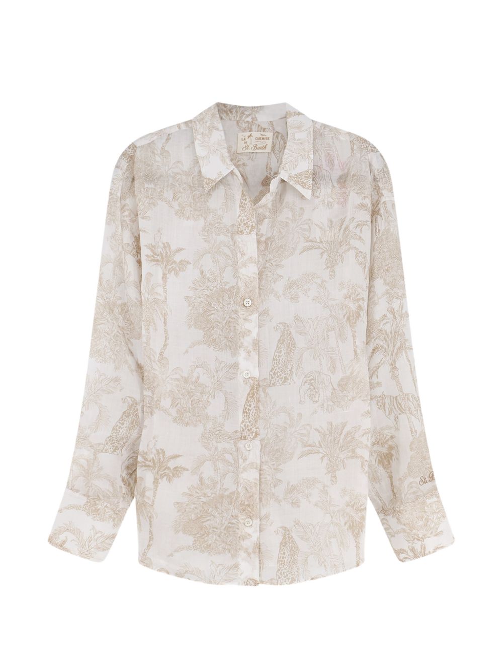 Realizzata in cotone, stampa toile de jouy all-over, maniche lunghe, chiusura con abbottonatura, colletto classico camicia, logo ricamato sulla manica, vestibilità over, 100% cotone