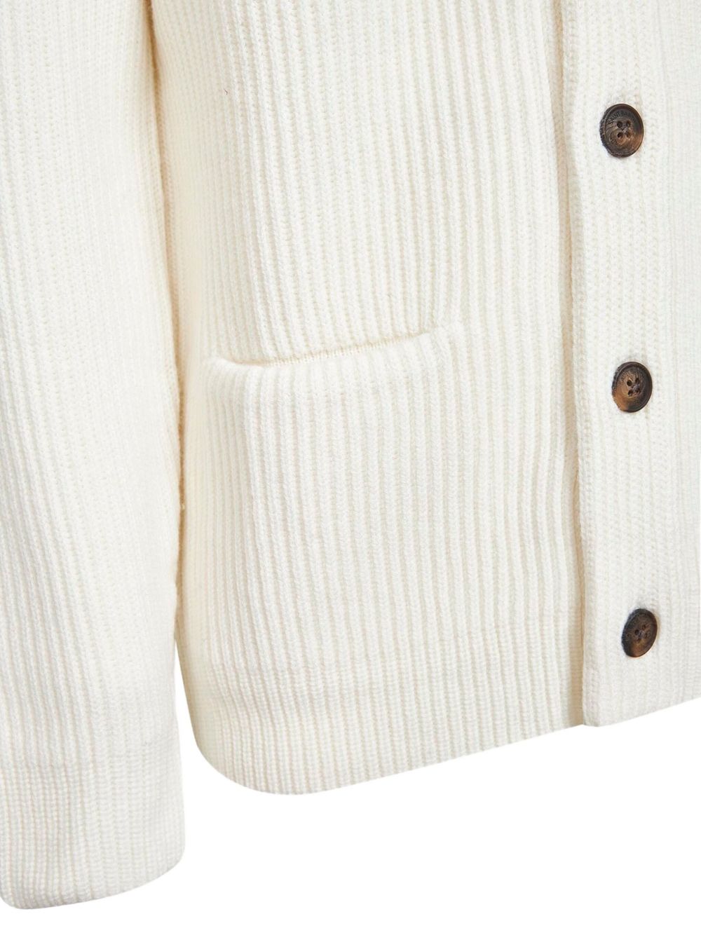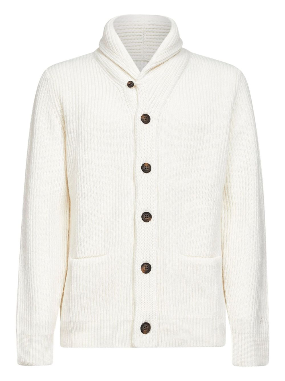 realizzato in lana merino cardata, scollo a scialle, fondo e polsi a coste, logo ricamato sul polso, vestibilità regolare, 100% lana