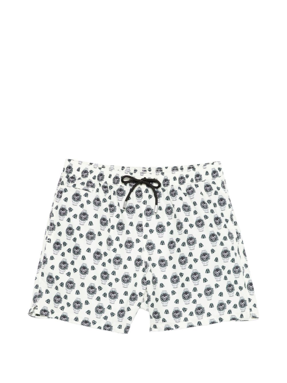 Realizzato in poliestere, vita elasticizzata con coulisse regolabile, due tasche a filo e una tasca posteriore con chiusura con bottone, stampa all over, mutandina interna elasticizzata, 100% poliestere