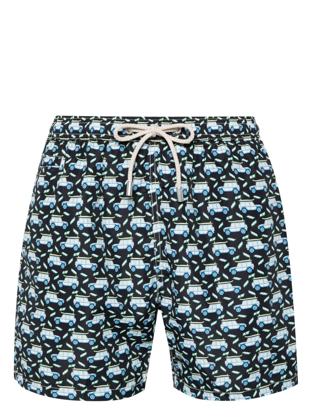 realizzato in tessuto con stampa all over, vita elasticizzata con coulisse, tasche laterali, retina interna, tasca sul retro, 100% poliestere riciclato