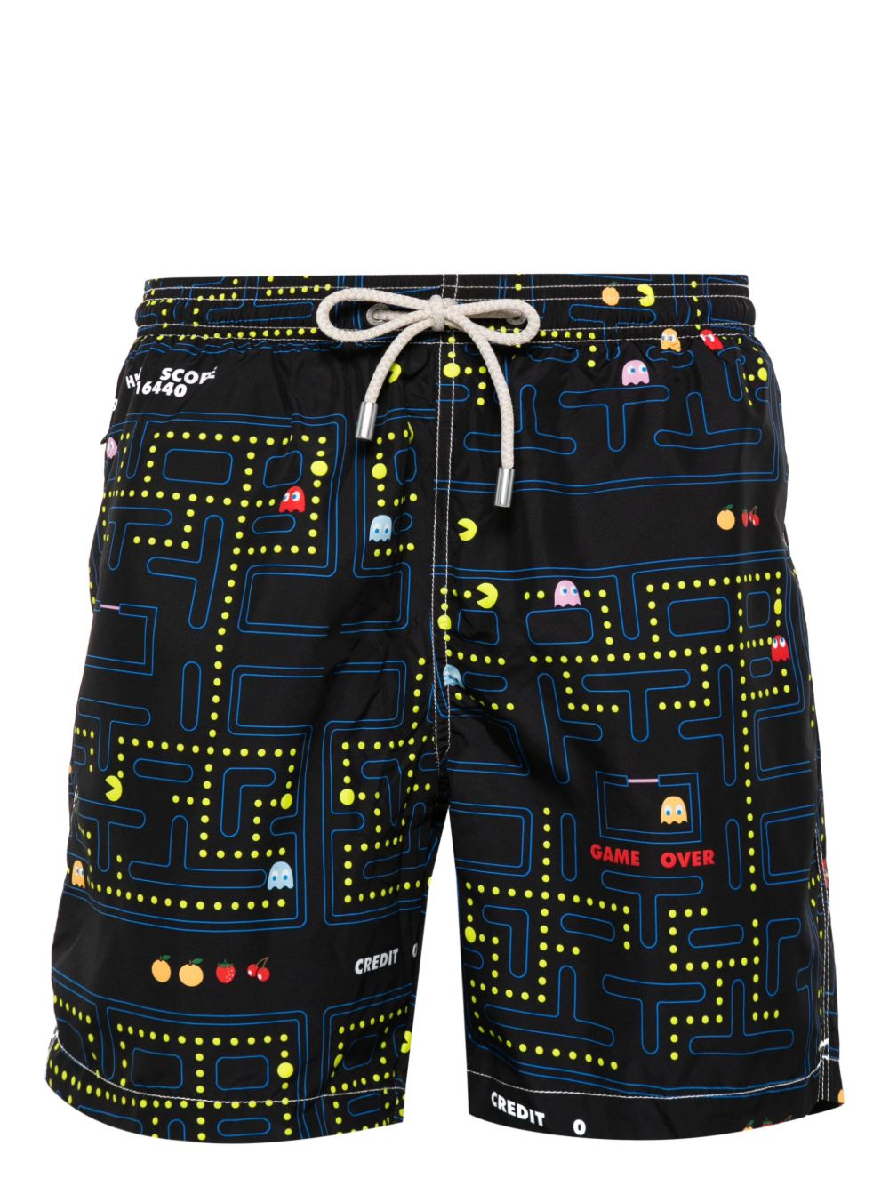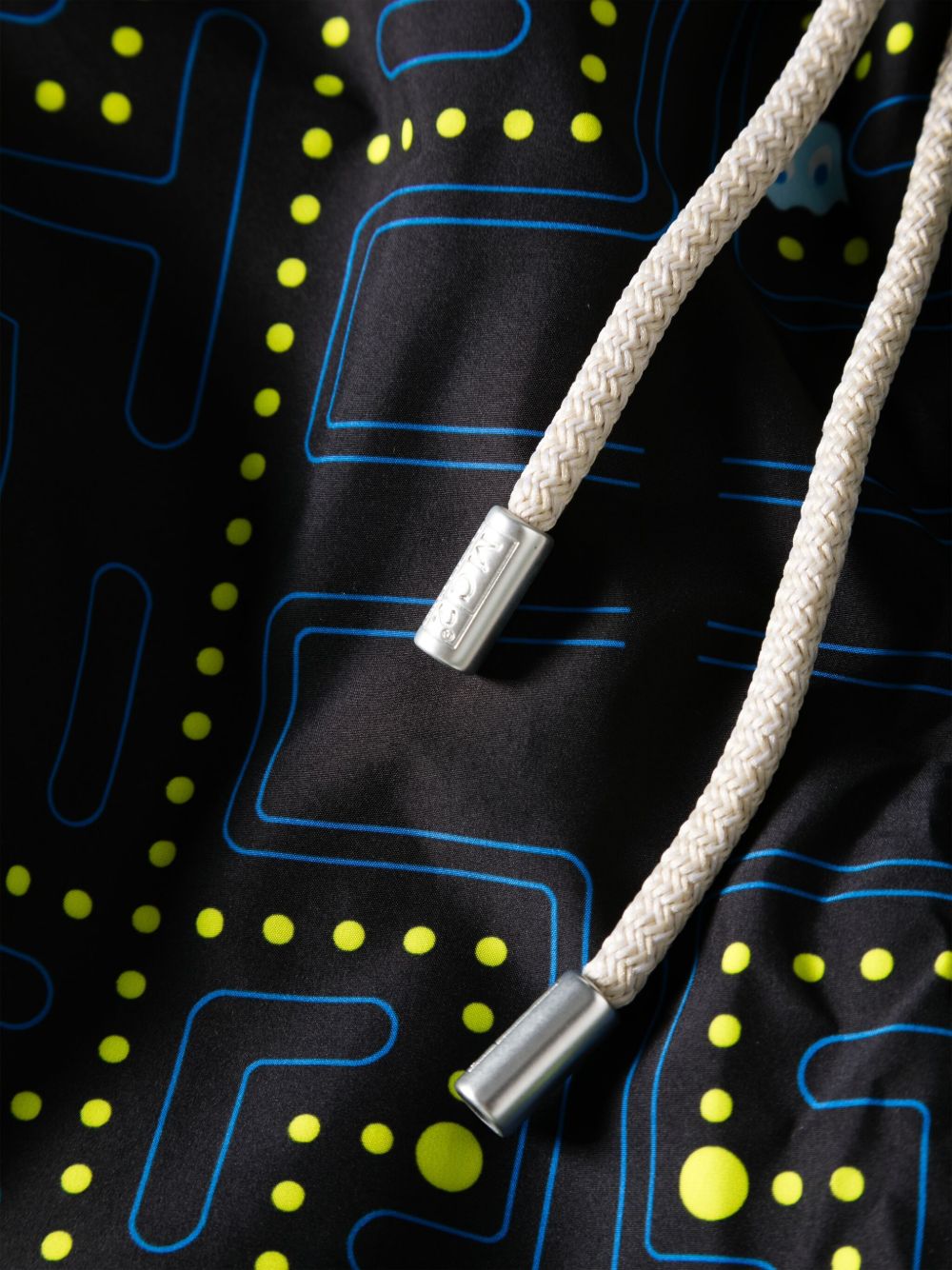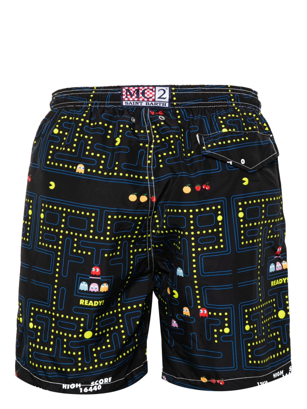 realizzato in tessuto con stampa all over, vita elasticizzata con coulisse, tasche laterali, retina interna, tasca sul retro, 100% poliestere riciclato