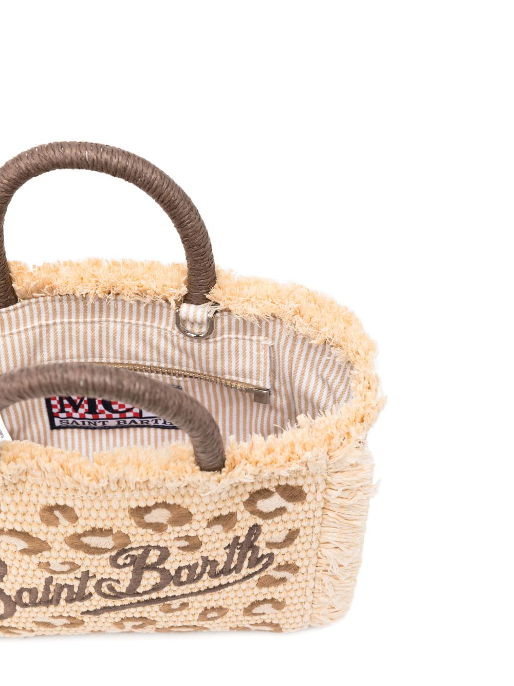 realizzata in tessuto effetto paglia, ricamo leopardato, logo ricamato sul davanti, manico rigido, tracolla regolabile e removibile, tasca interna con zip, lunghezza 15 cm, altezza 15 cm, profondità 8 cm