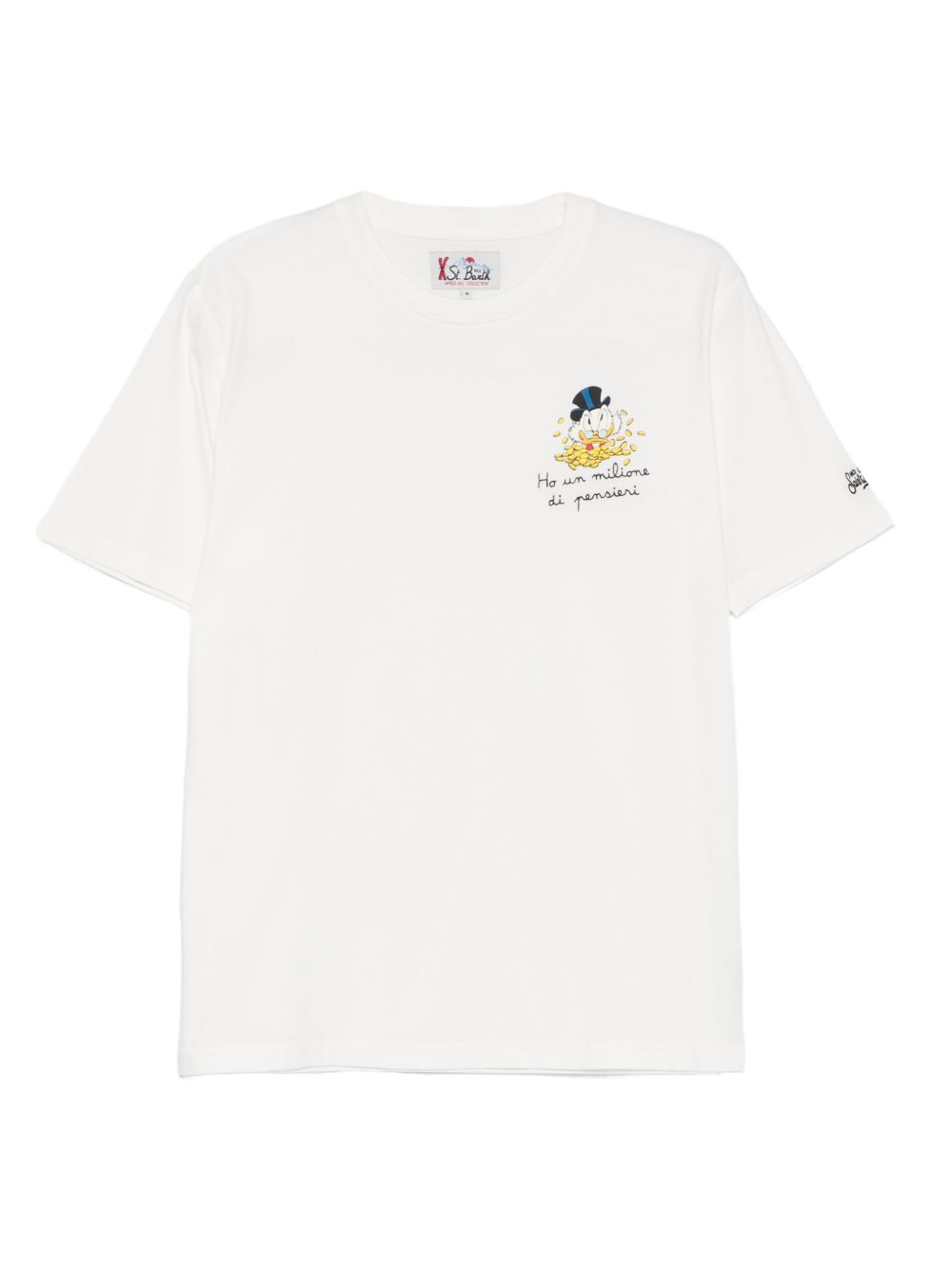 realizzata in cotone, ricamo sul petto con paperone, logo sulla manica, orlo dritto