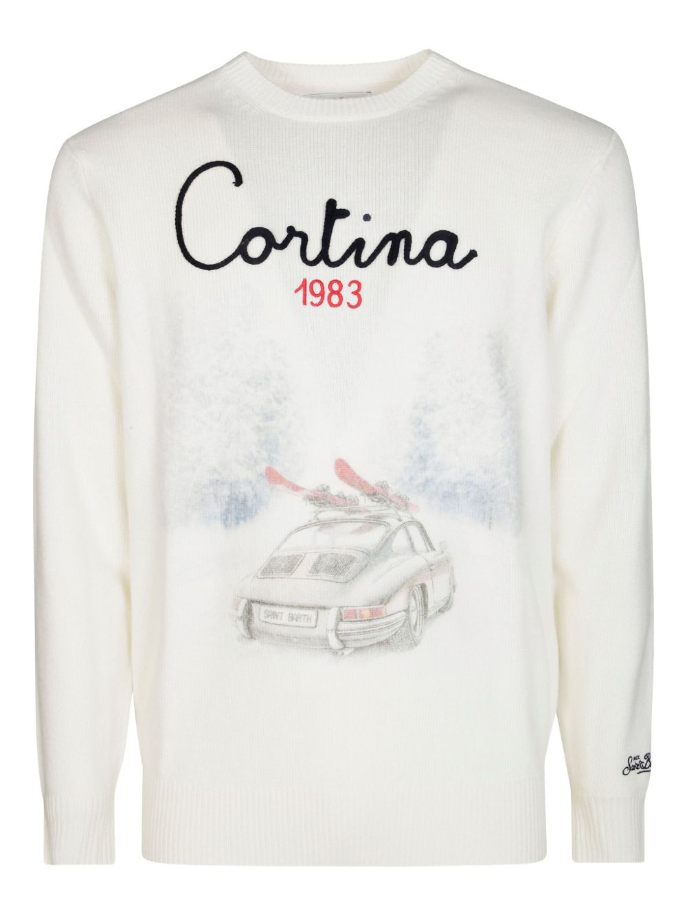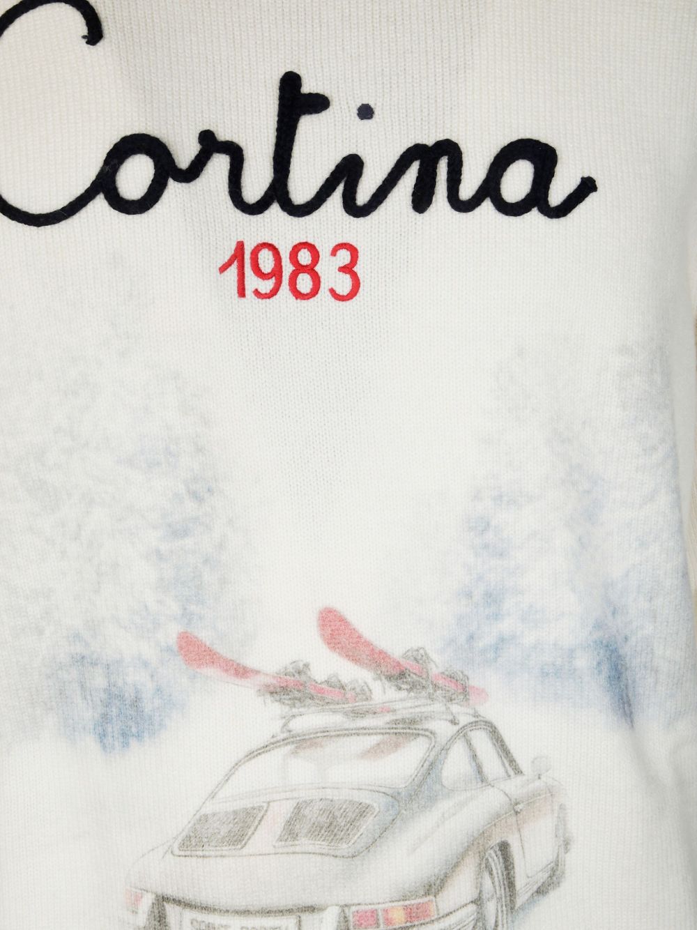 realizzata in misto lana, grafica jacquard cartolina Cortina sci, bordi a costine, vestibilità regolare, 40% lana, 10% cashmere, 25% viscosa, 25% poliammide