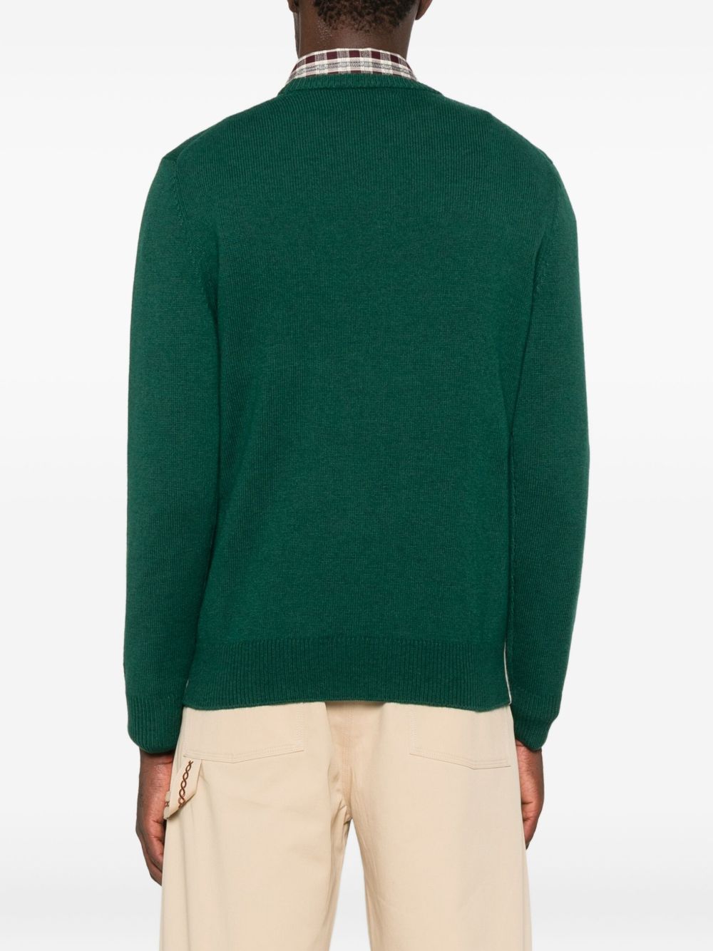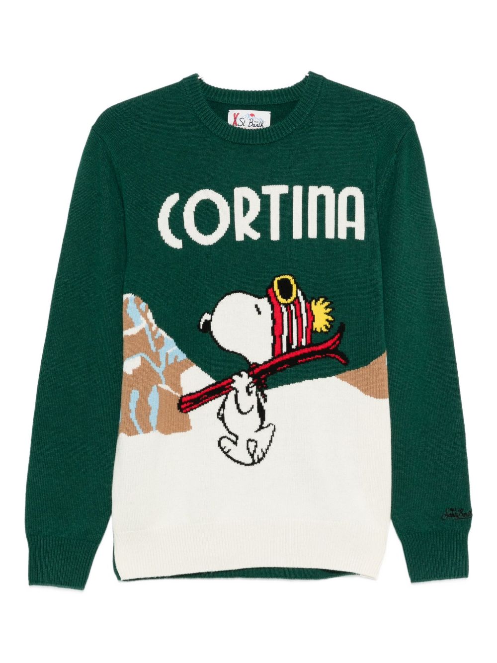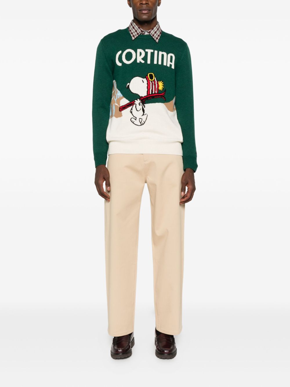 realizzato in misto lana, ricamo jacquard con Snoopy, bordi a costine, vestibilità regolare, 40% lana, 25% viscosa, 25% poliestere, 10% cashmere