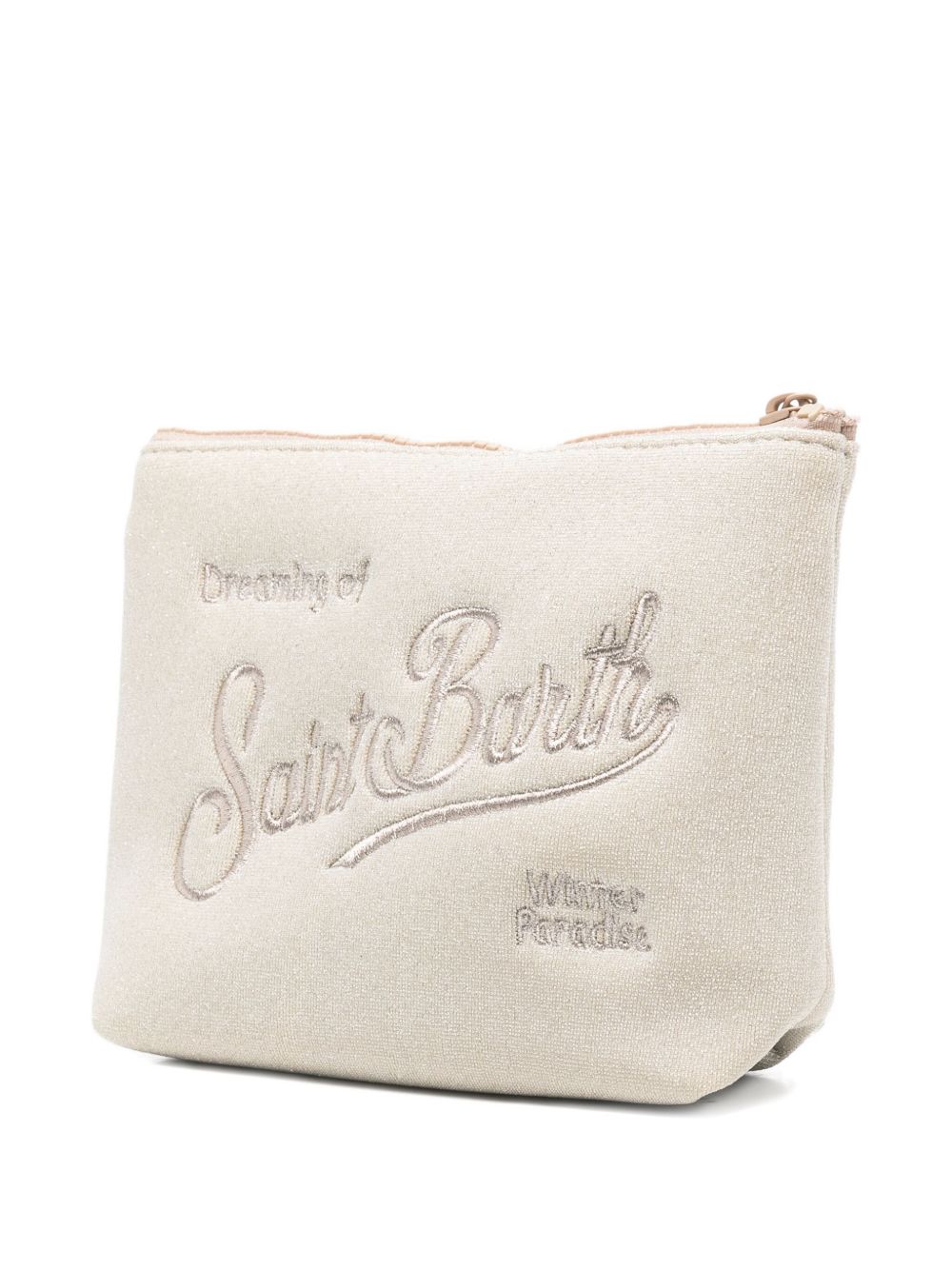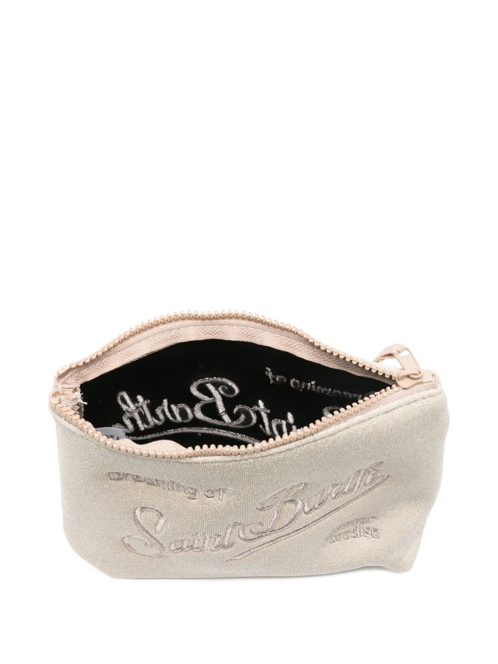 realizzata in tessuto lurex, logo ricamato sul davanti, chiusura superiore con zip, passante per polso in gros grain, lunghezza 21 cm, altezza 15.5 cm, profondità 7 cm