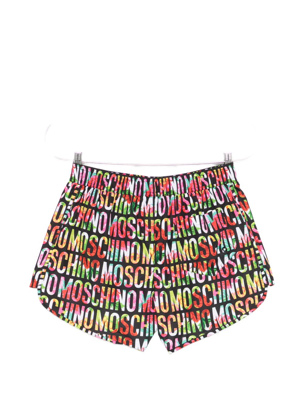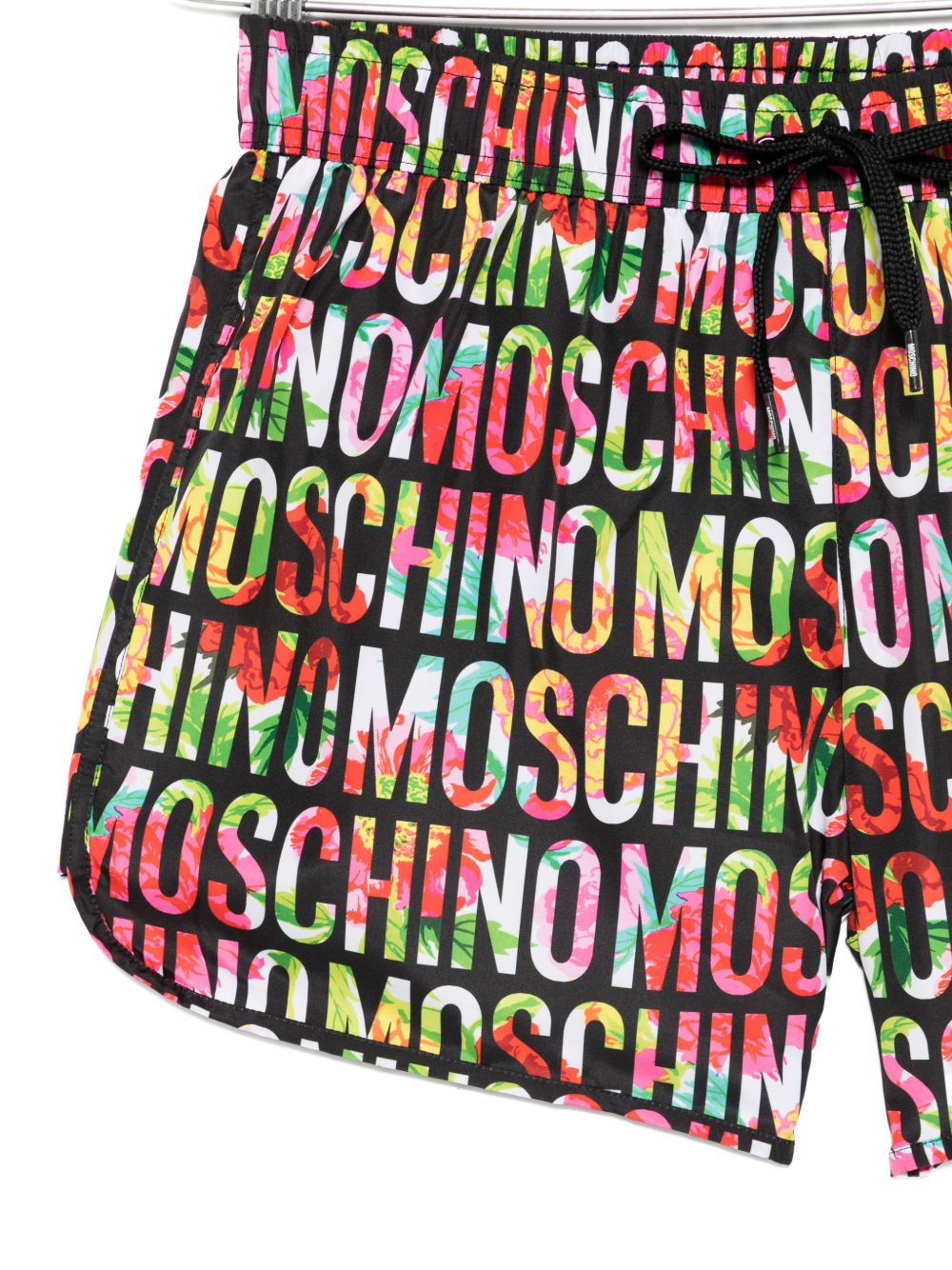 Costume Moschino da uomo con fantasia su base nera, ideale per chi cerca un capo mare con identità grafica forte.
