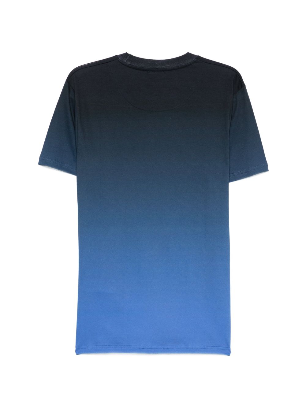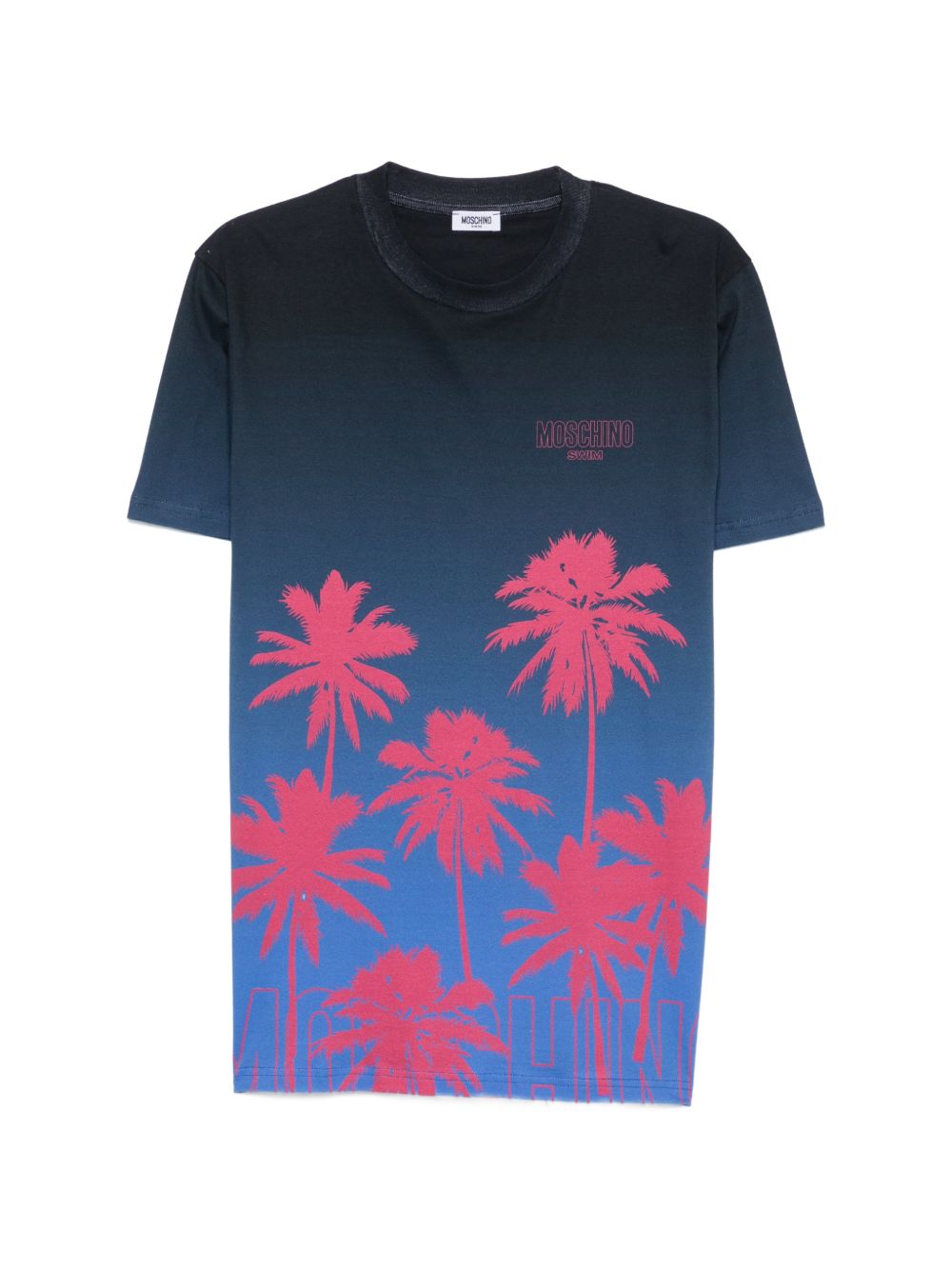 T-shirt Moschino da uomo azzurra con effetto sfumato ombré e stampa palme. Il disegno richiama unestetica estiva e vacanziera, mantenendo il taglio classico girocollo.
