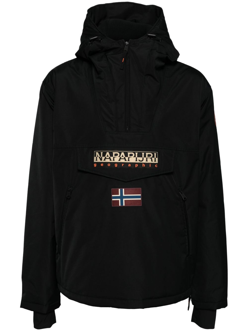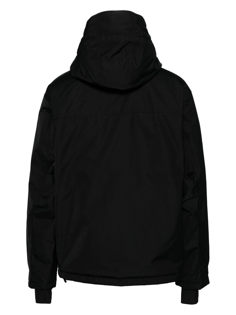 realizzata in nylon riciclato, resistente all'acqua, traspirante, apertura laterale con zip, cappuccio regolabile con coulisse e logo stampato, tasca frontale a marsupio con zip, imbottito, vestibilità regolare