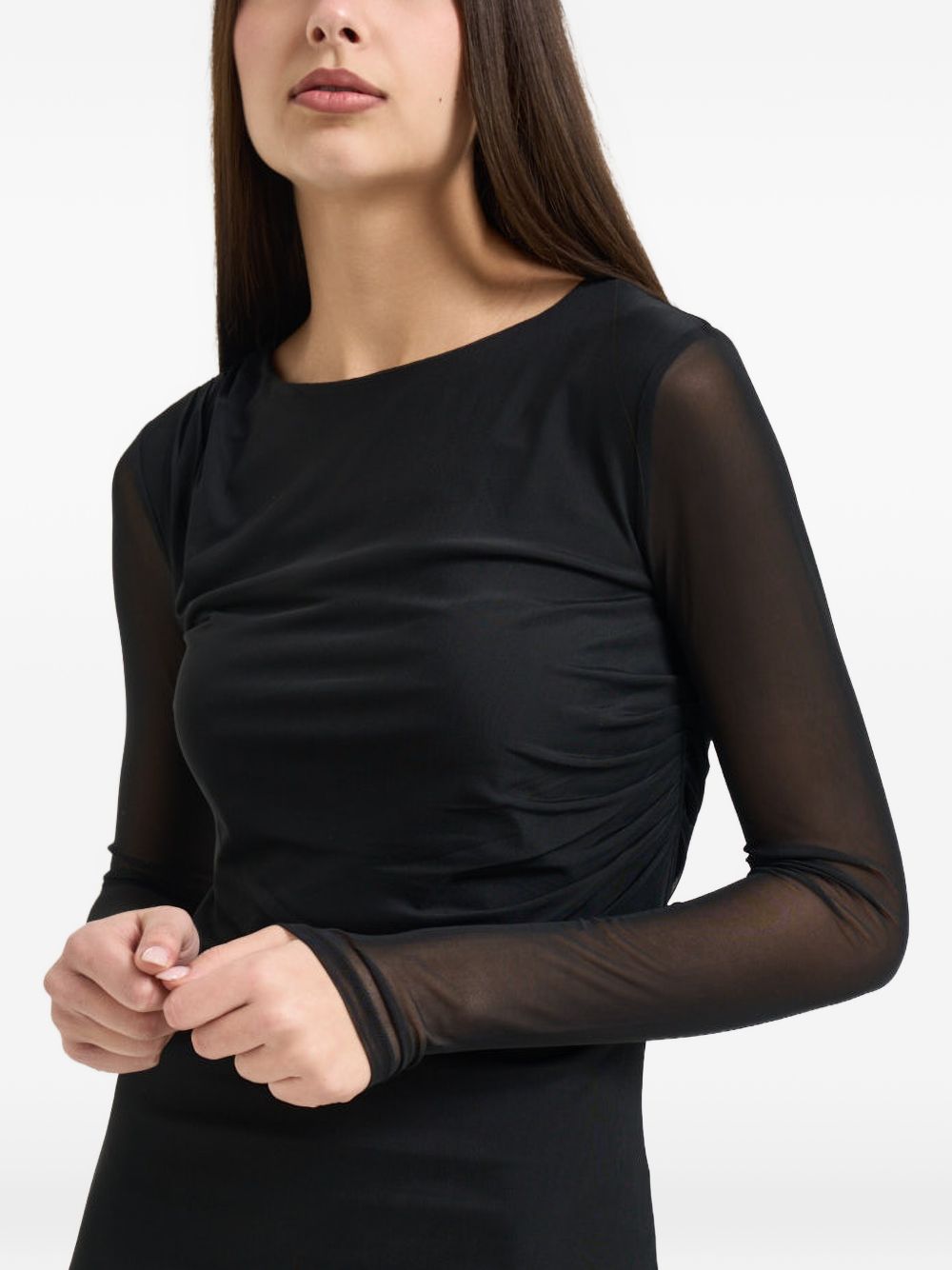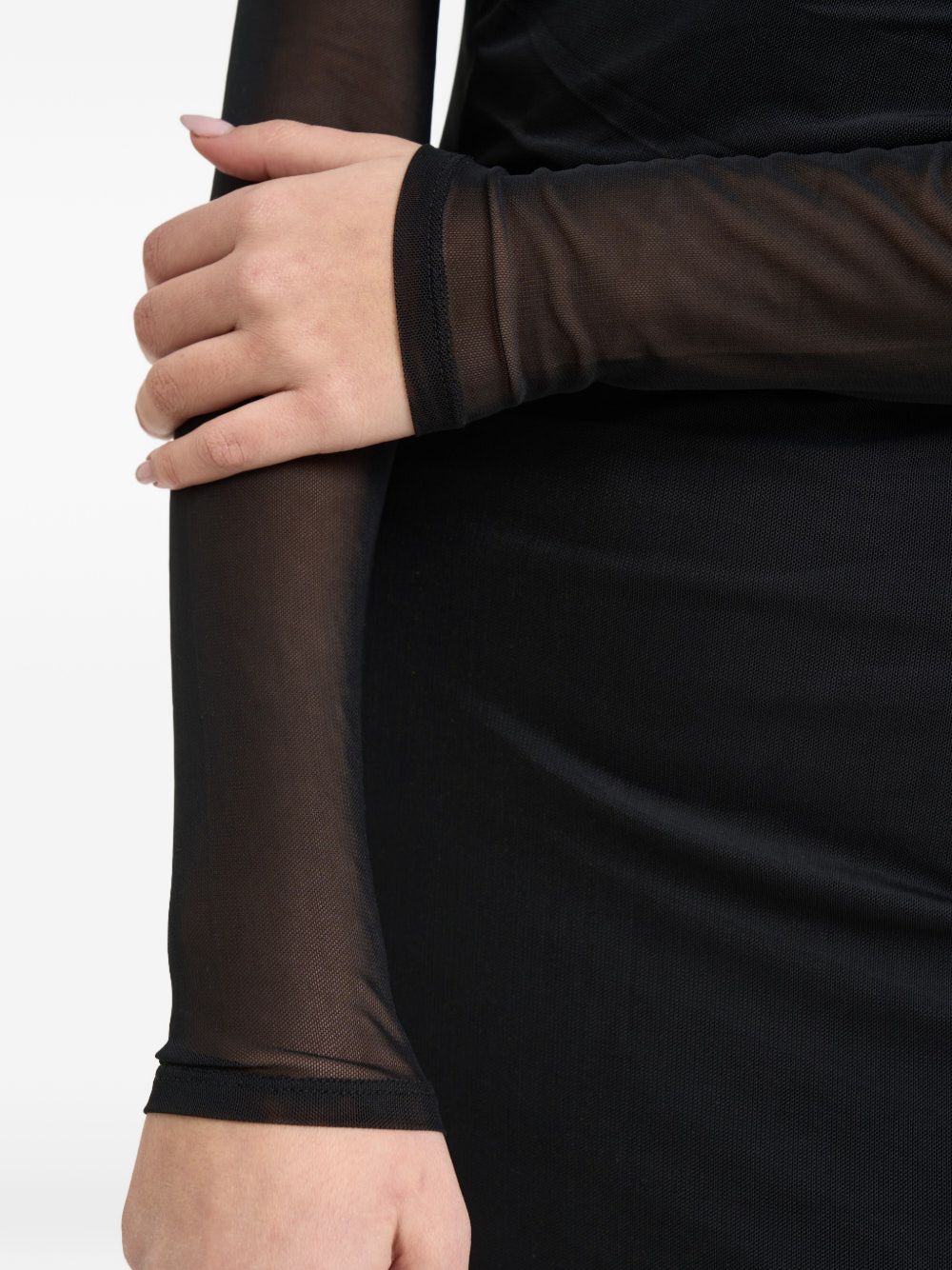 Realizzato in tessuto, maniche lunghe trasparenti, scollo rotondo, lunghezza midi, 100% tessuto