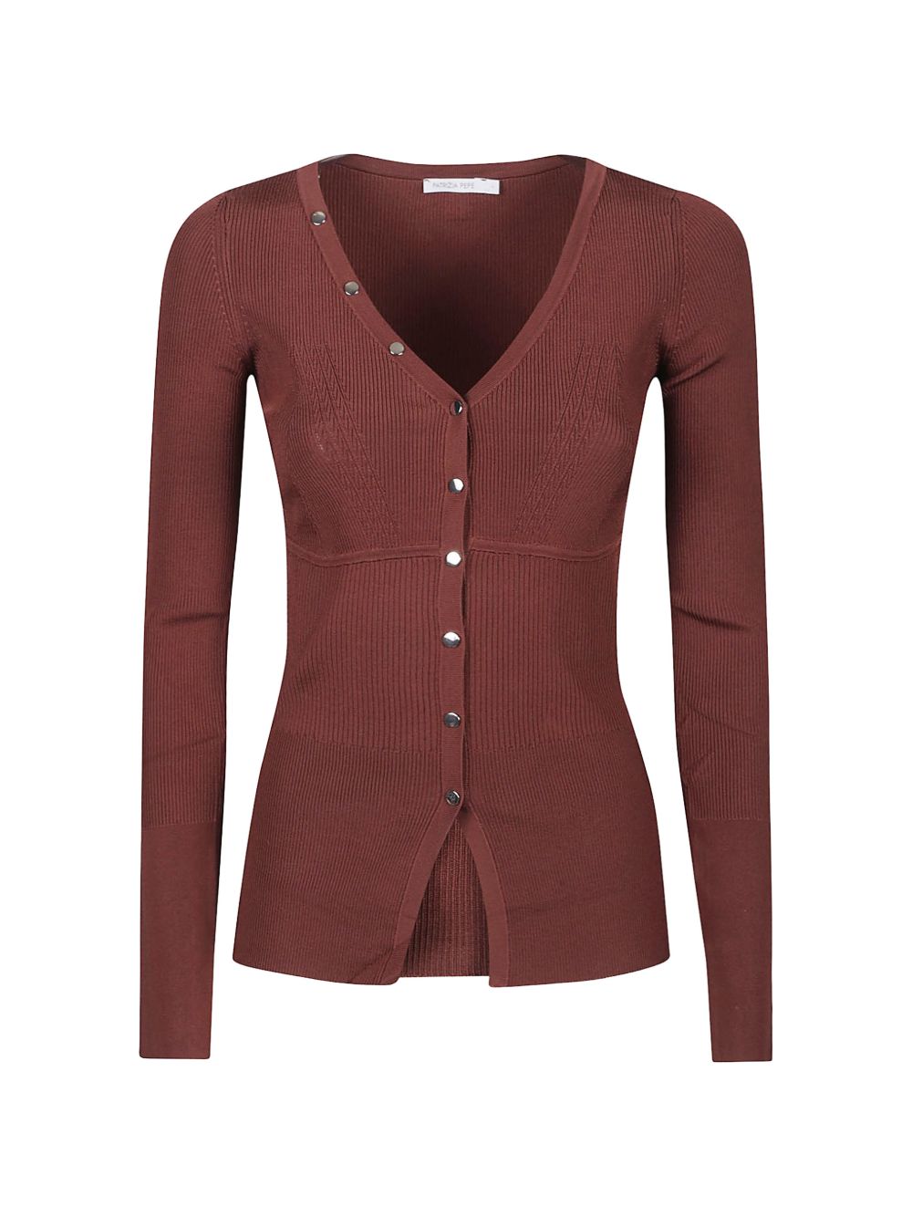 Realizzato in misto viscosa, lavorazione a coste, scollo a V, chiusura con bottoni a pressione, maniche lunghe, 80% viscosa, 20% poliammide
