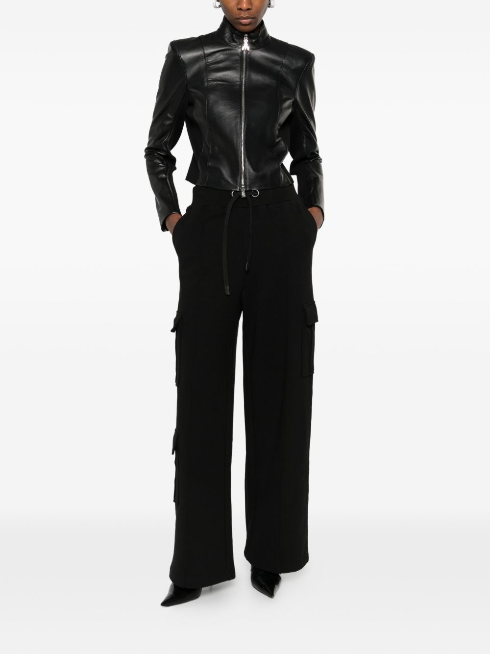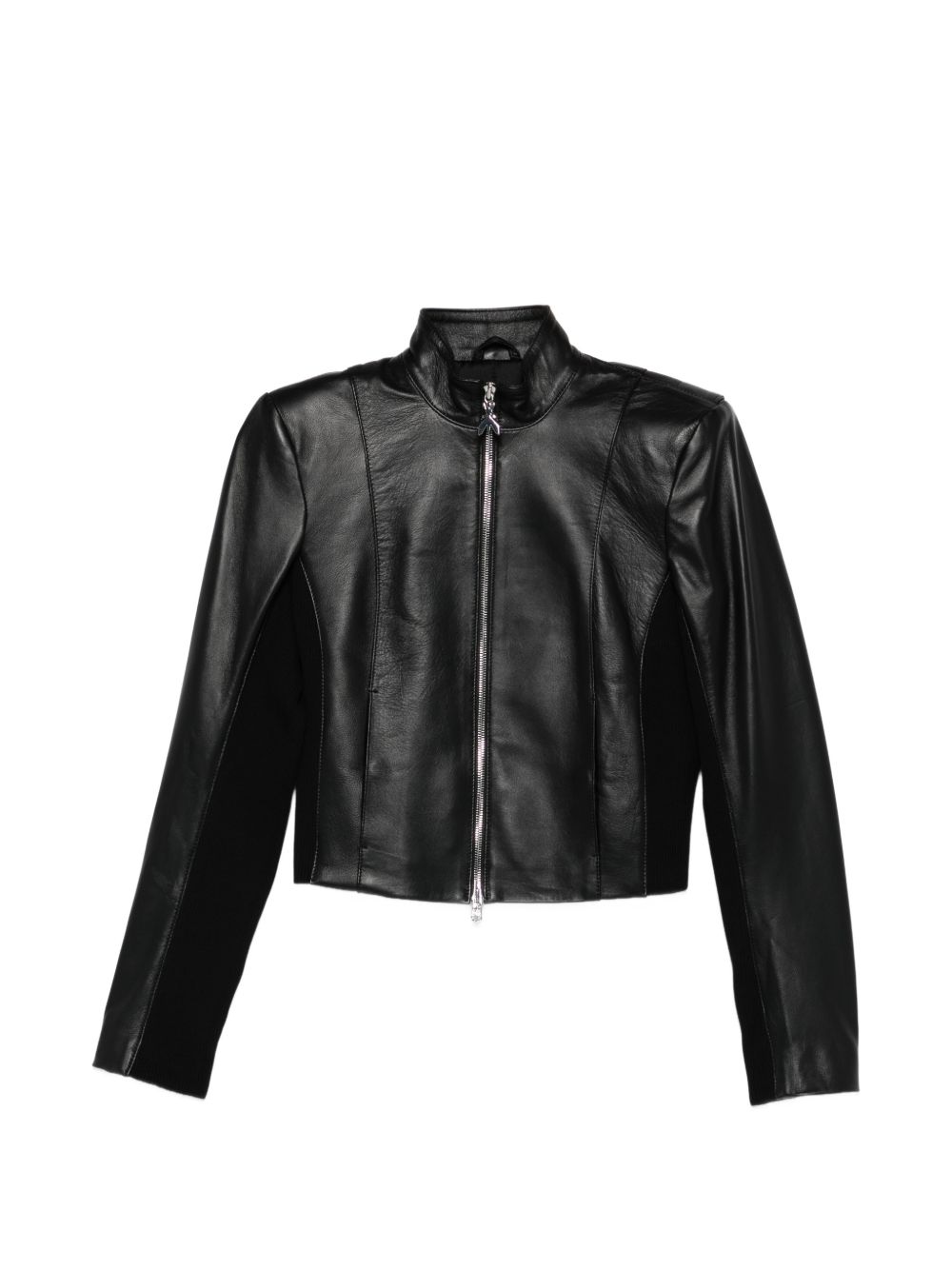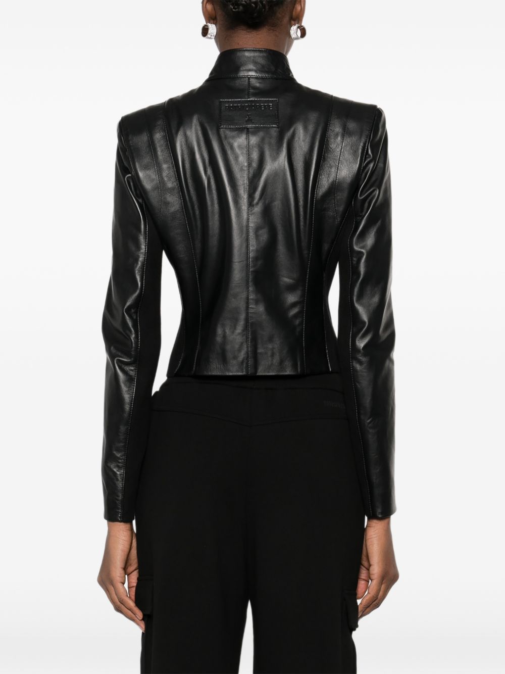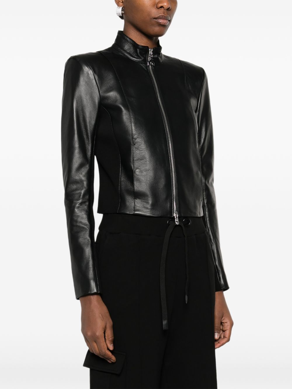 Realizzata in pelle di montone, chiusura con zip con dettaglio logo in metallo color argento, collo alto, patch logo impressa dietro.
