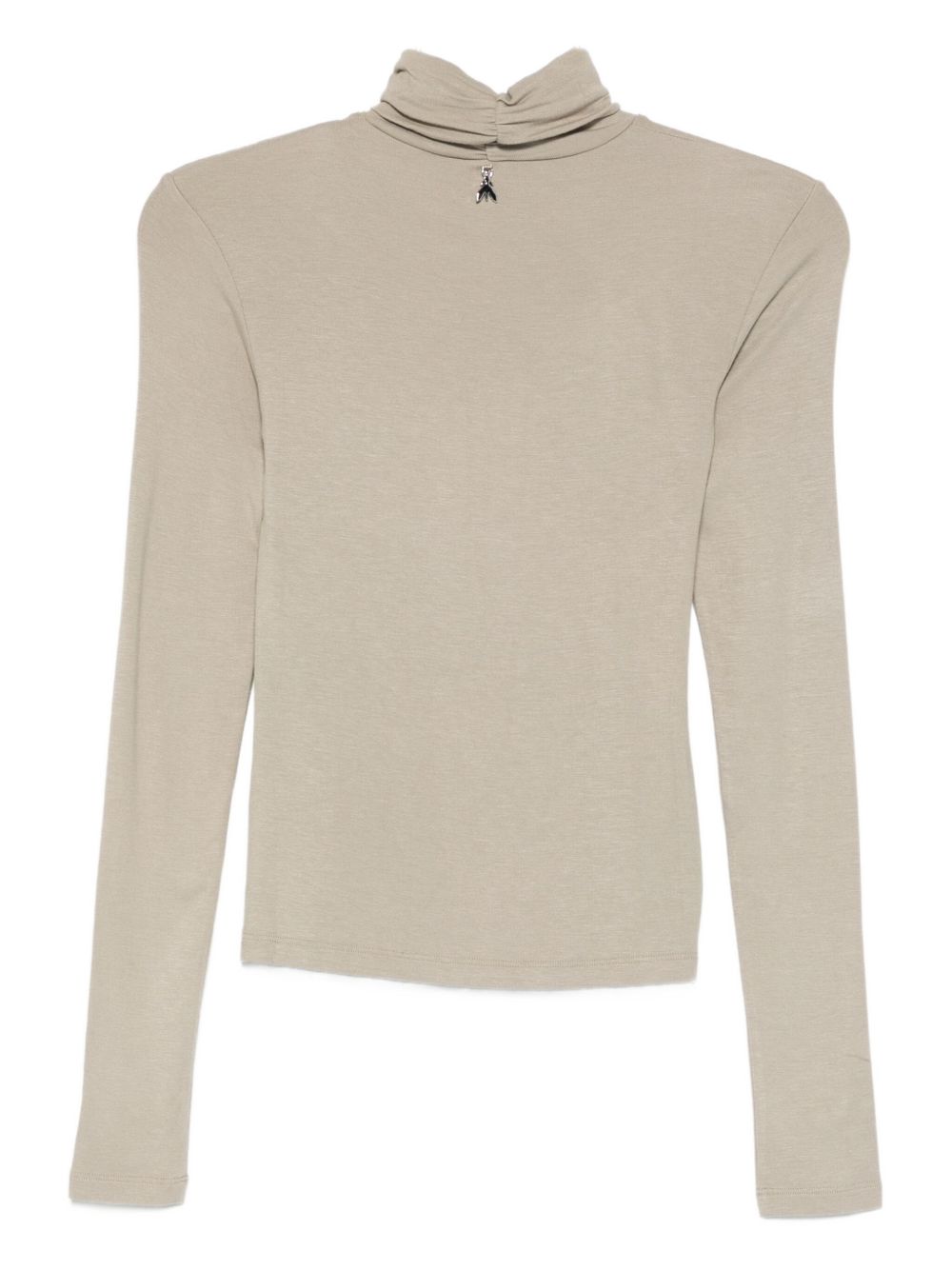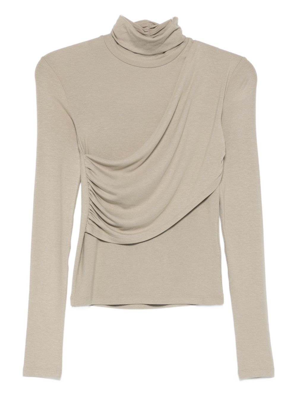 Realizzata in jersey di viscosa stretch, maniche lunghe, collo alto con intreccio sul retro, drappeggio davanti, dettaglio logo dietro, vestibilità slim, 94% viscosa, 6% elastan