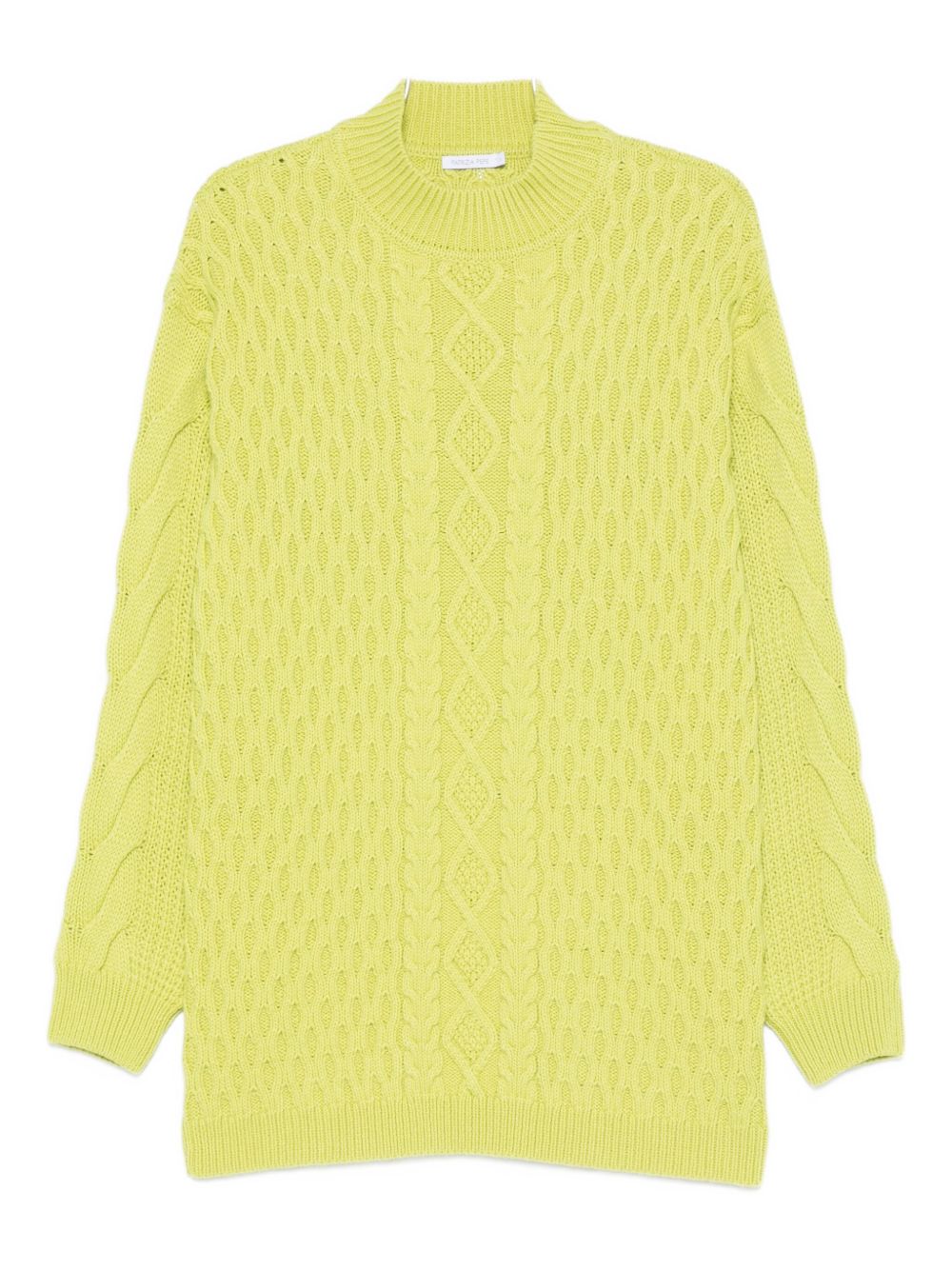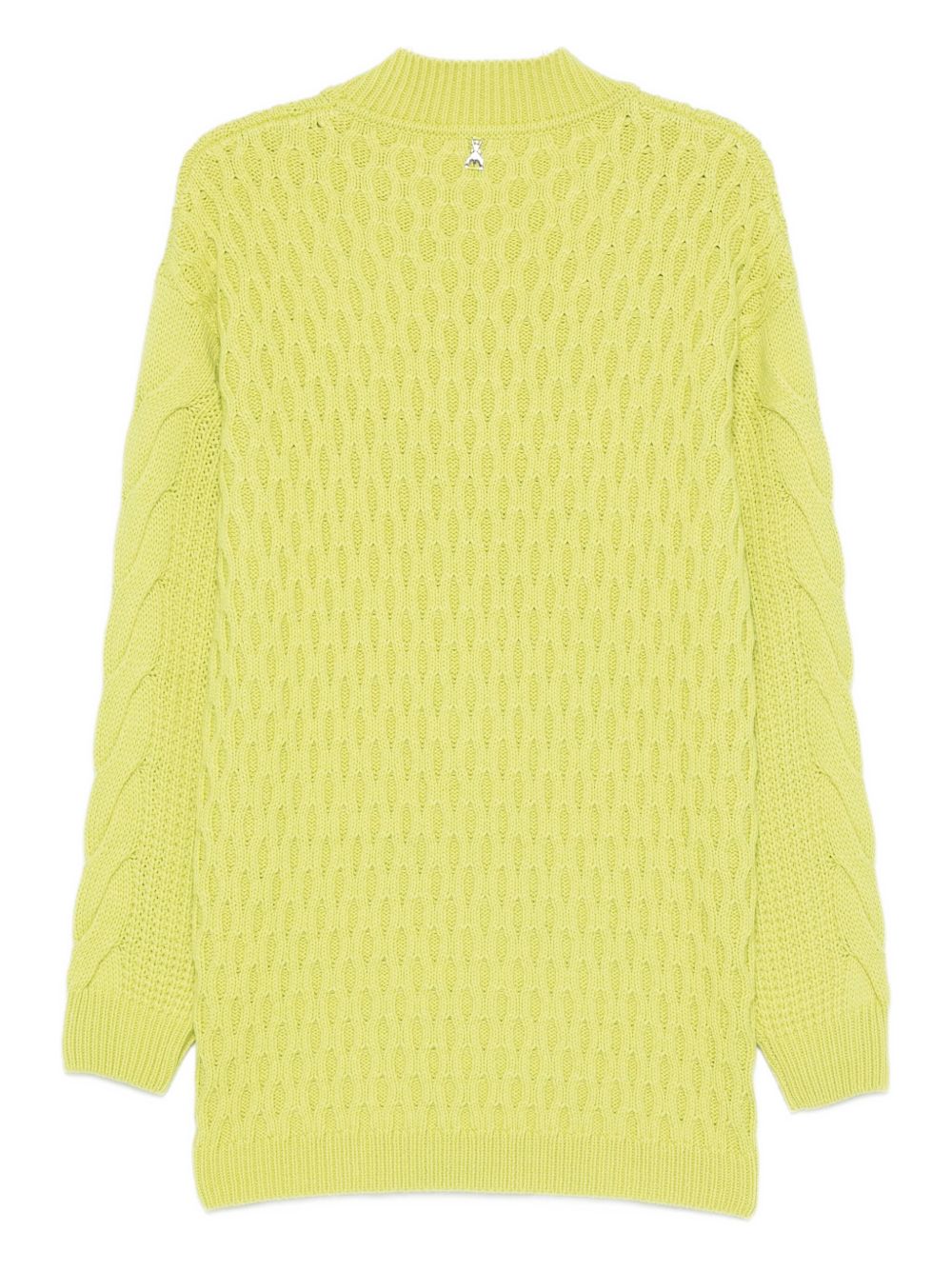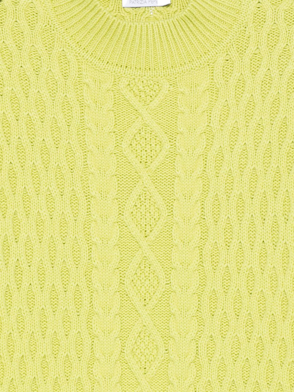 Realizzata in mista lana, lavorazione punto treccia, girocollo, maniche lunghe, placca con logo dietro, vestibilità oversize, 50% acrilica, 50% lana