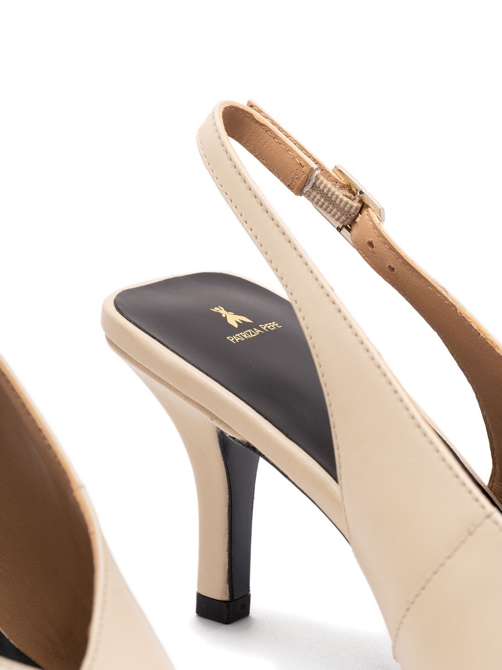 tomaia realizzata in pelle, cinturino sul retro regolabile con fibbia logata, fodera in pelle, tacco alto 7.5 cm