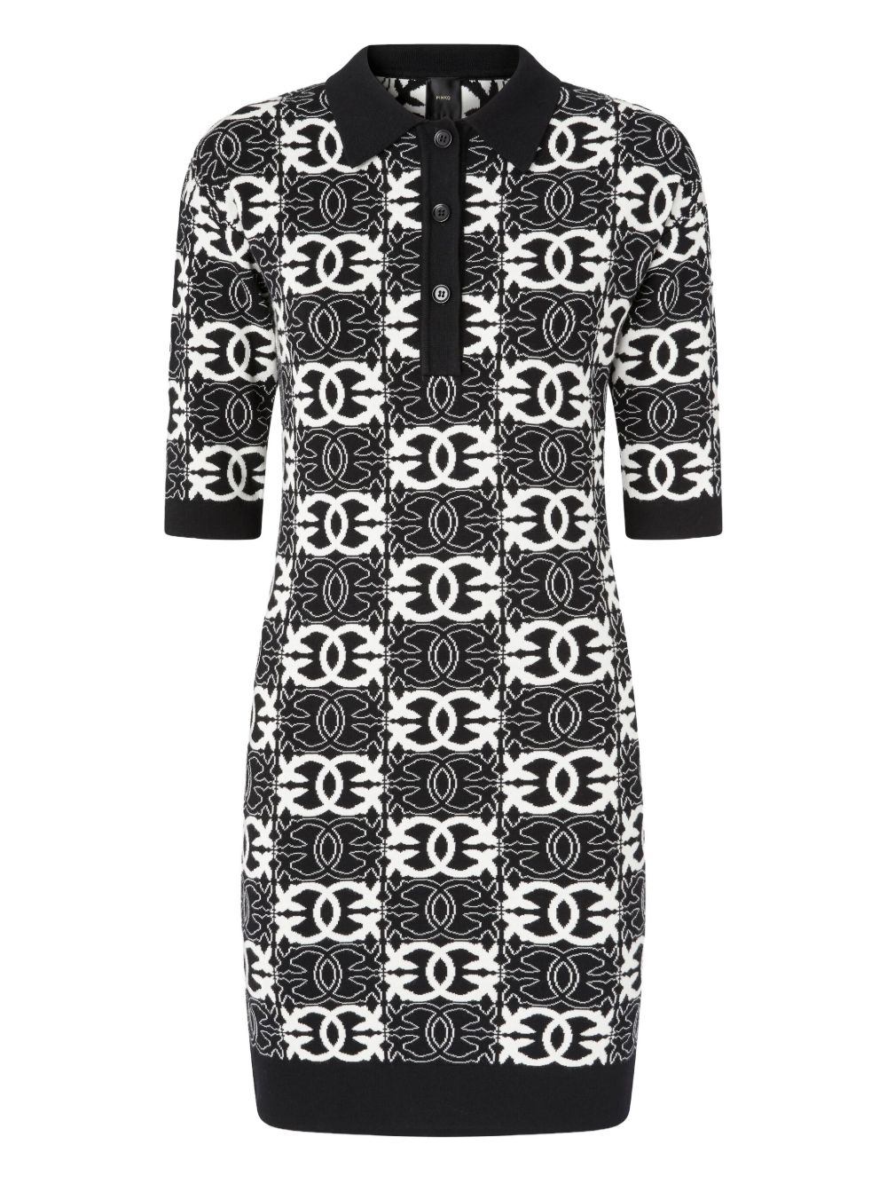 Realizzato in viscosa con lavorazione jacquard, colletto polo con chiusura a bottoni, pattern logato, vestibilità aderente, 72% viscosa, 28% poliestere
