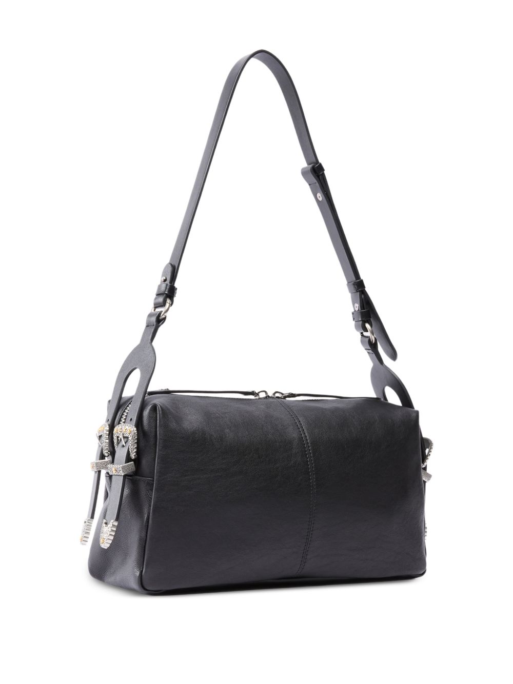 realizzata in pelle, forma rettangolare, chiusura superiore con zip a doppio cursore, manico regolabile, dettagli con fibbie metalliche, 100% pelle di vitello, altezza 12 cm, lunghezza 34 cm, profondità 18 cm