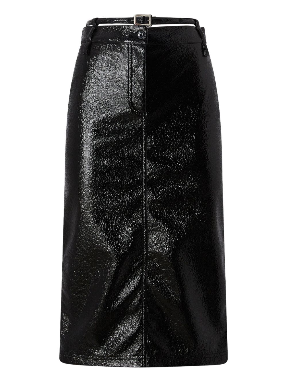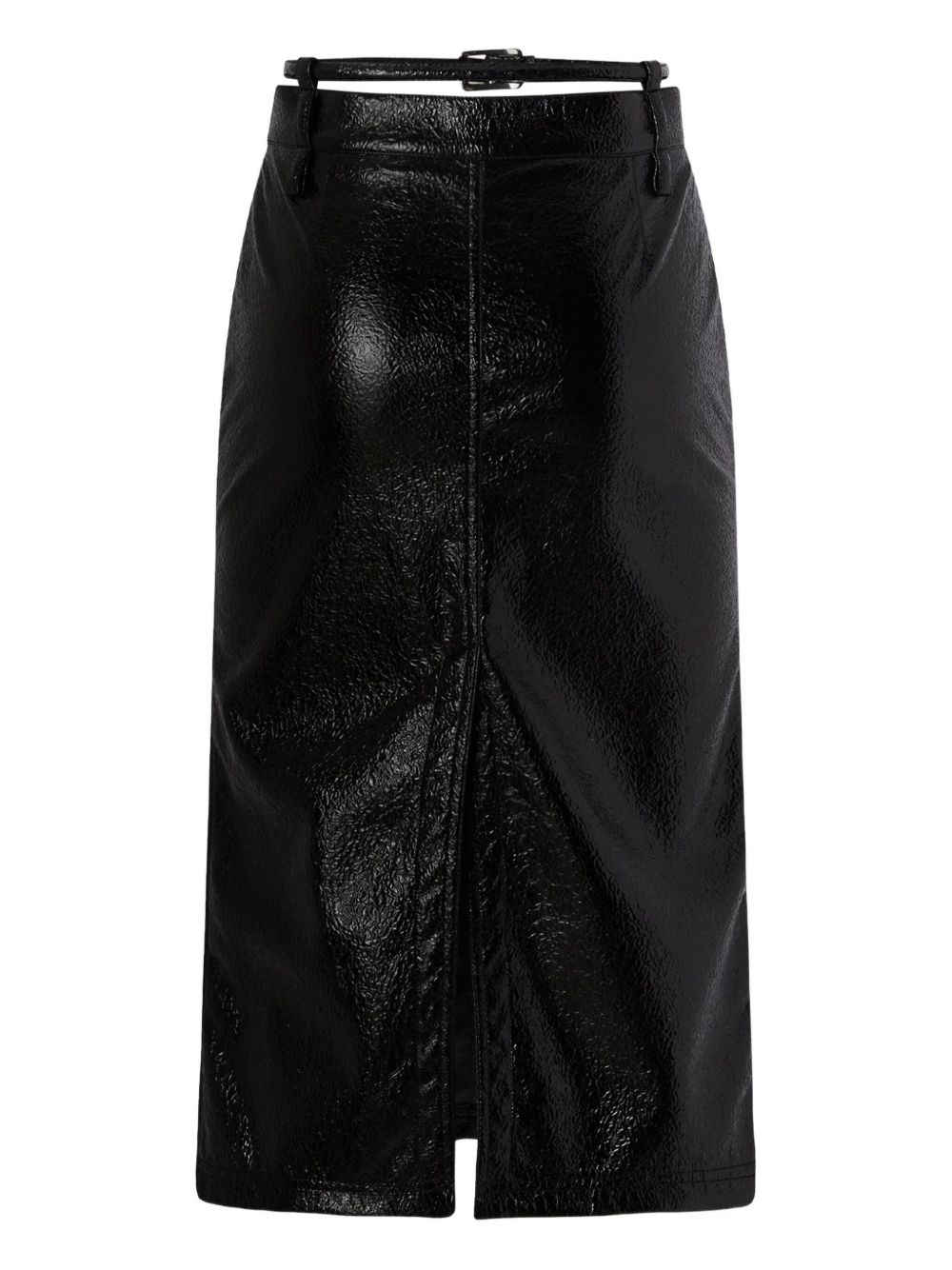 realizzata in morbido jersey con spalmatura effetto vernice, chiusa in vita con zip e bottone, vita con passanti e cintura abbinata removibile, 100% poliestere