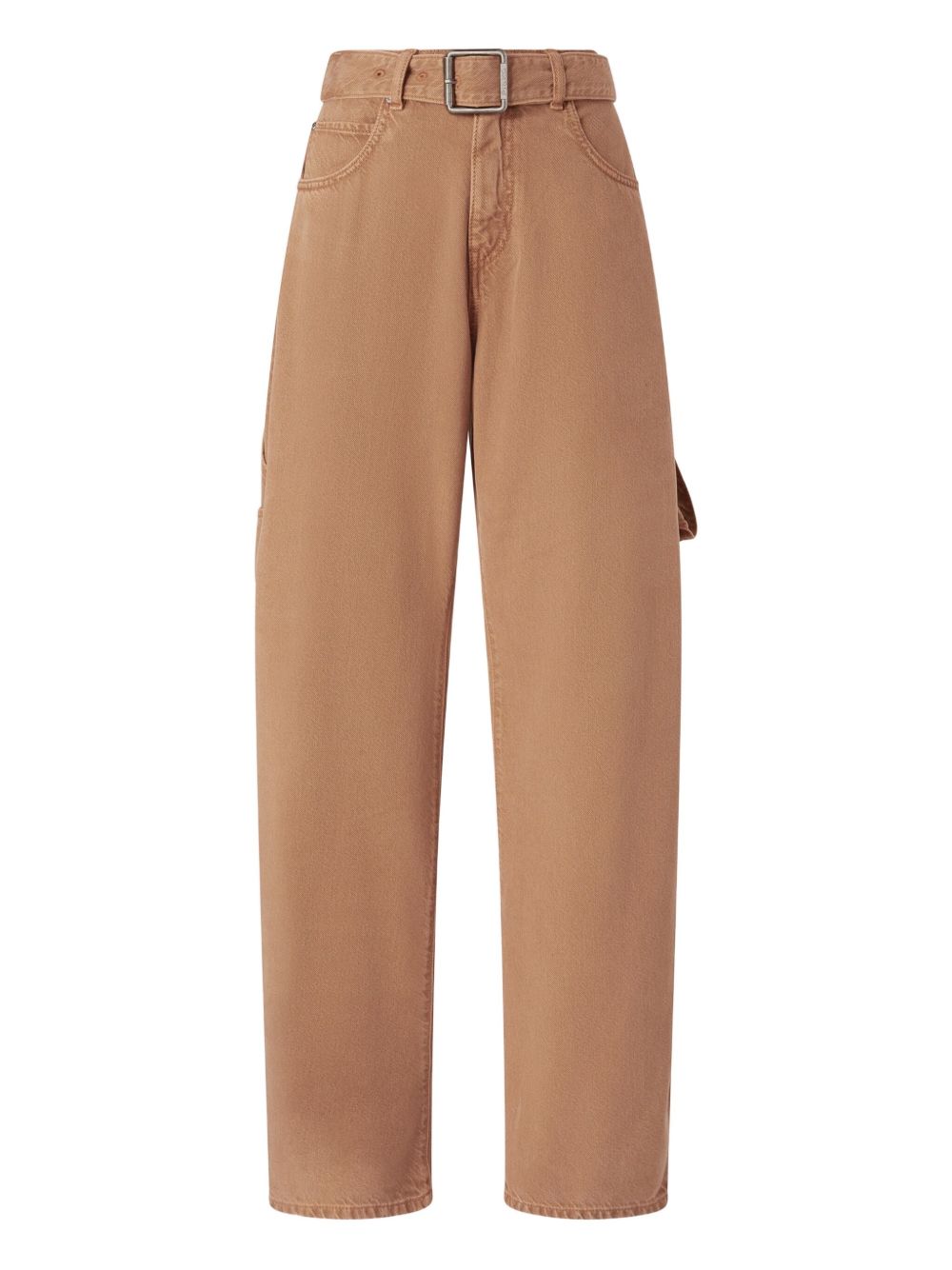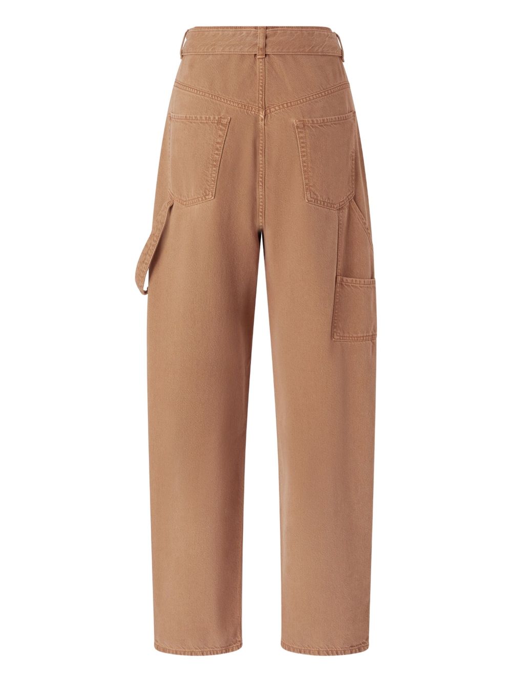 realizzato in denim di cotone e lyocell, chiusura con cerniera nascosta e bottone, cinque tasche workwear, cintura con fibbia in metallo removibile, cinturino portamartello esterno nella gamba sinistra, gamba arrotondata nella parte superiore e più stretta in fondo.