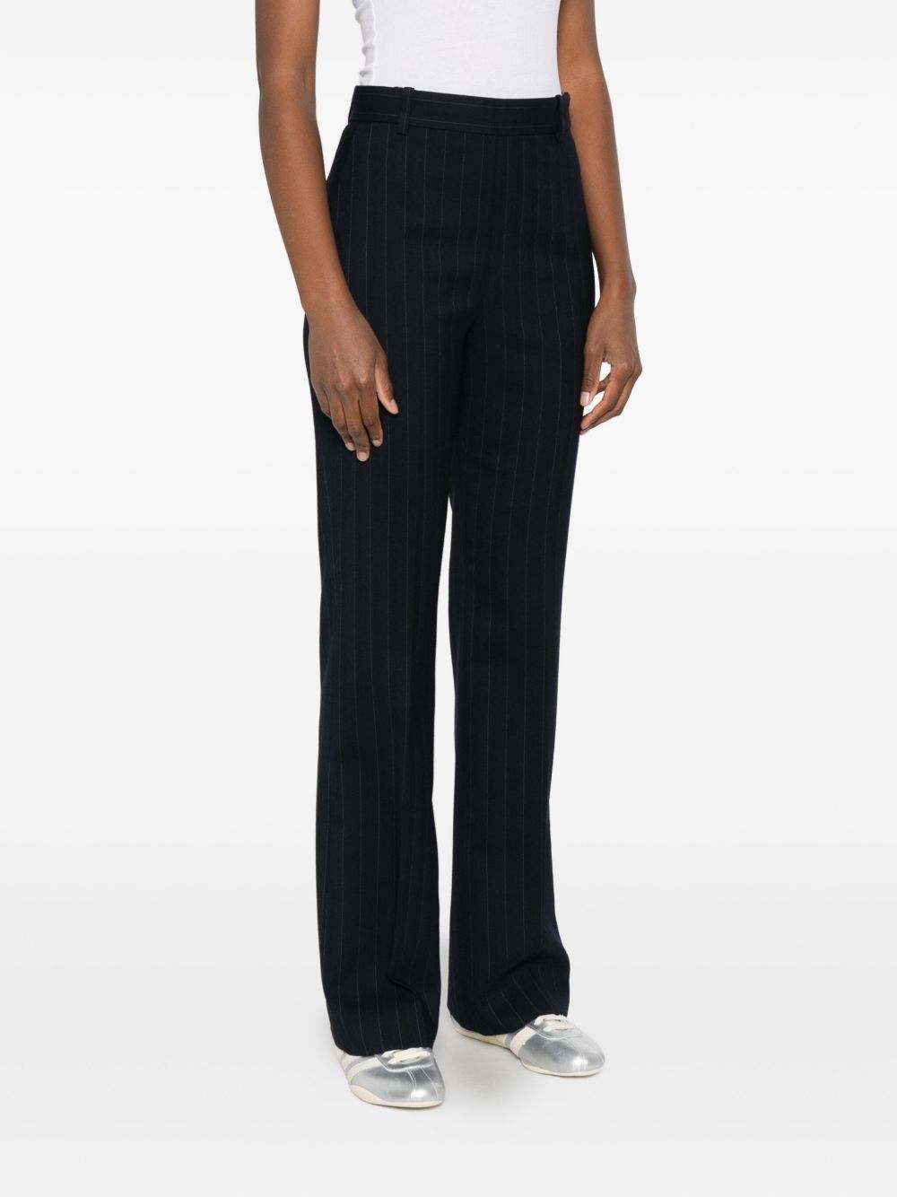 realizzato in tessuto gessato in lana pony, chiusura davanti nascosta, passanti in vita per cintura, tasca a filetto dietro, gamba dritta.