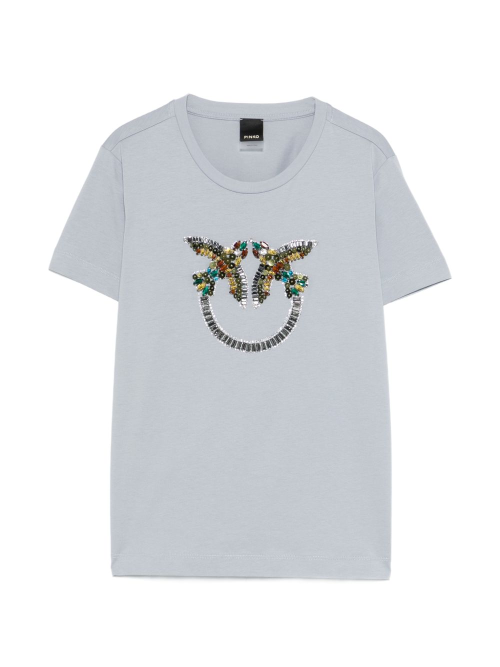 realizzata in morbido jersey di cotone, maxi ricamo gioiello sul petto con cristalli e paillettes multicolor, maniche corte, orlo dritto