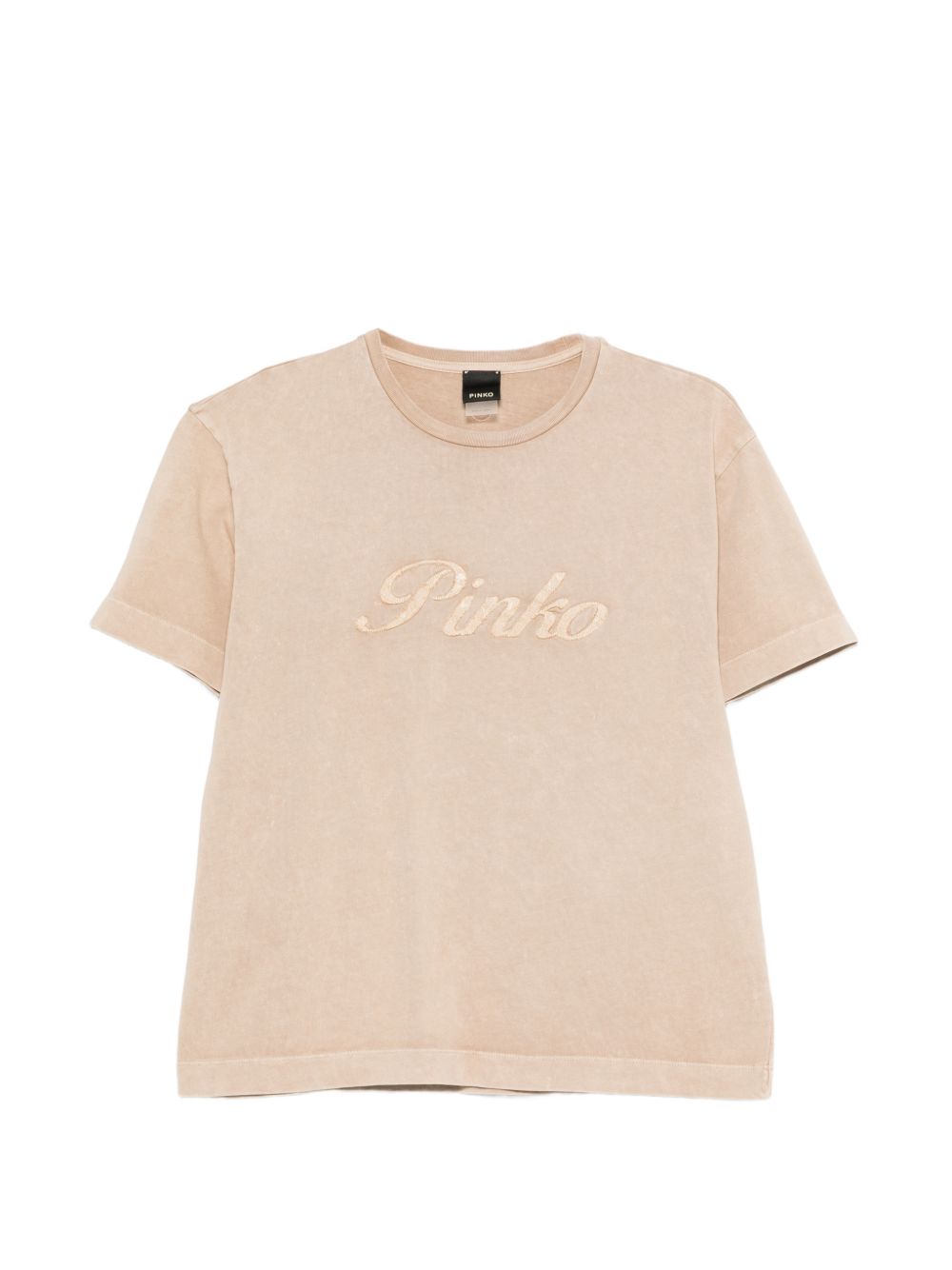 T-shirt Pinko in tonalità beige con stampa scritta frontale, caratterizzata da uno stile casual ma riconoscibile.