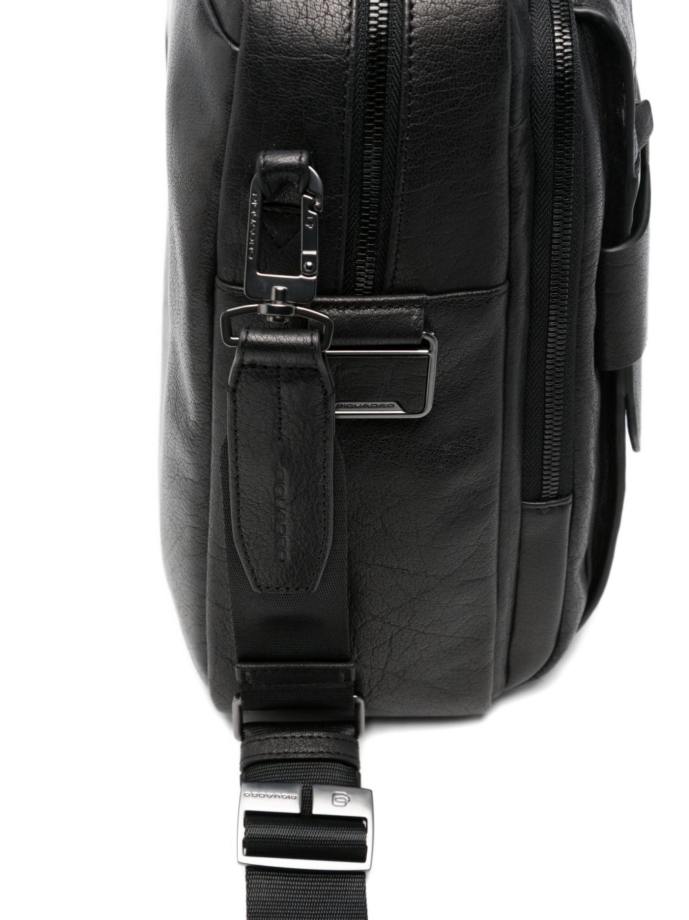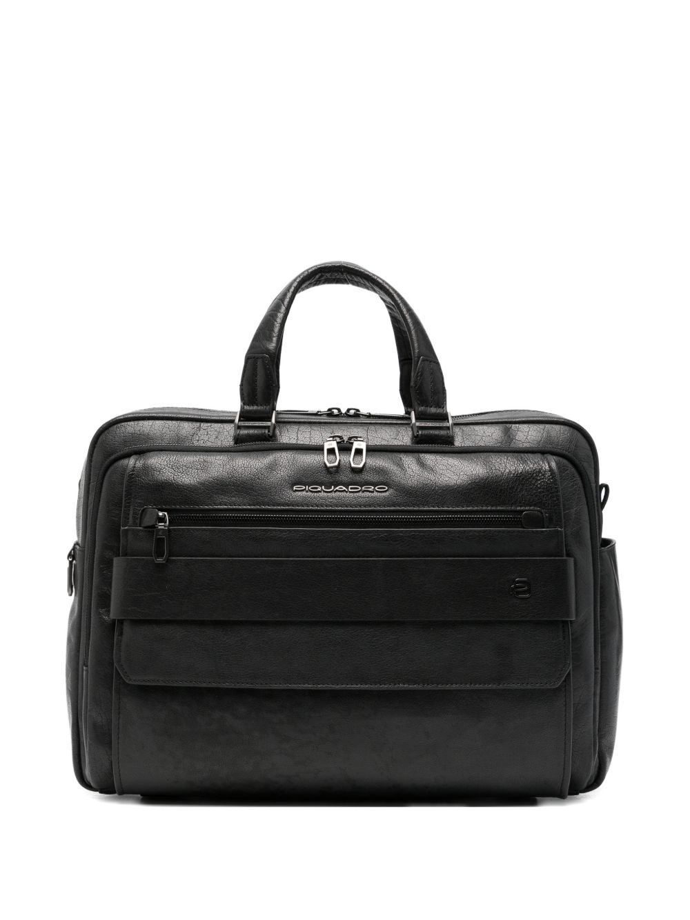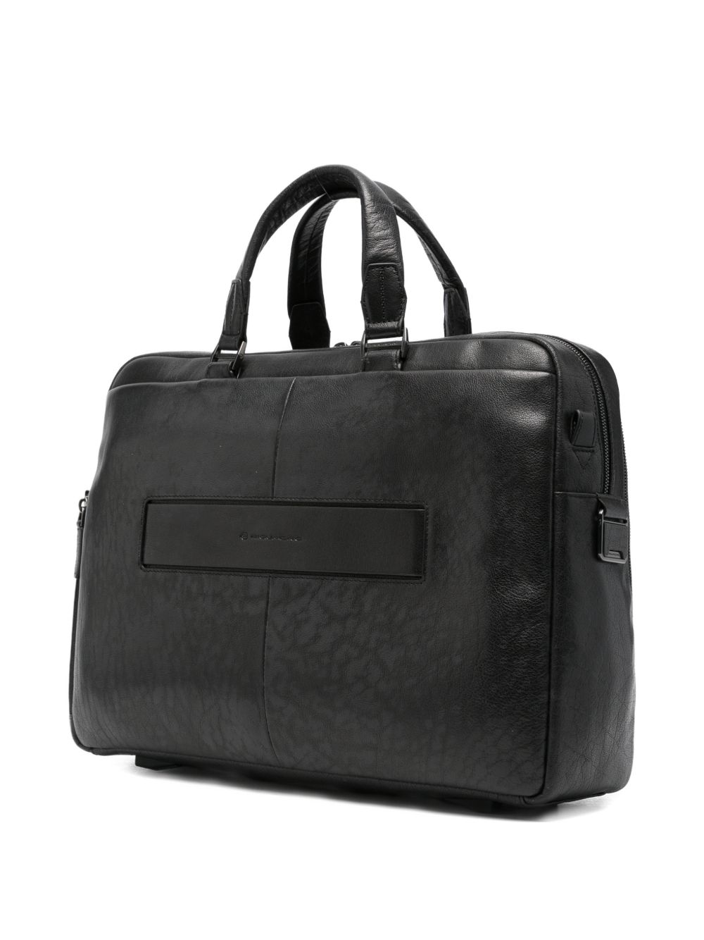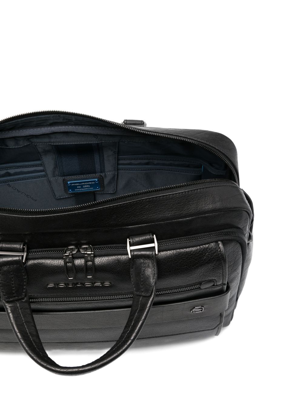 Realizzata in pelle, logo davanti, tracolla removibile, piedino in gomma per appoggio, scomparti con chiusura a zip, manici fissi, tasca per power bank AirPods e per ricarica ad induzione, scomparto per pc fino a 15"6', fodera interna in poliestere, 42 x 29 x 15 (cm)