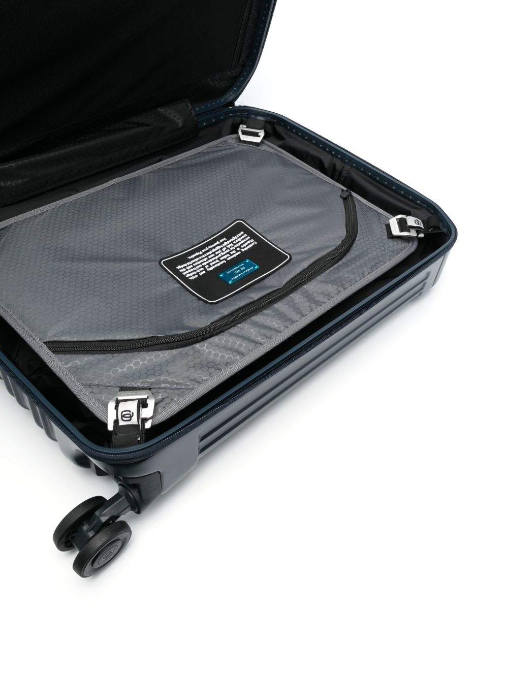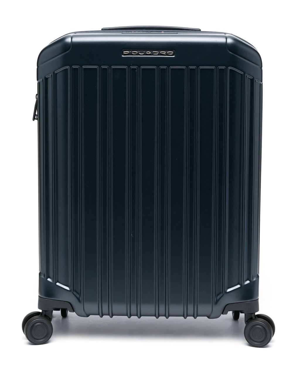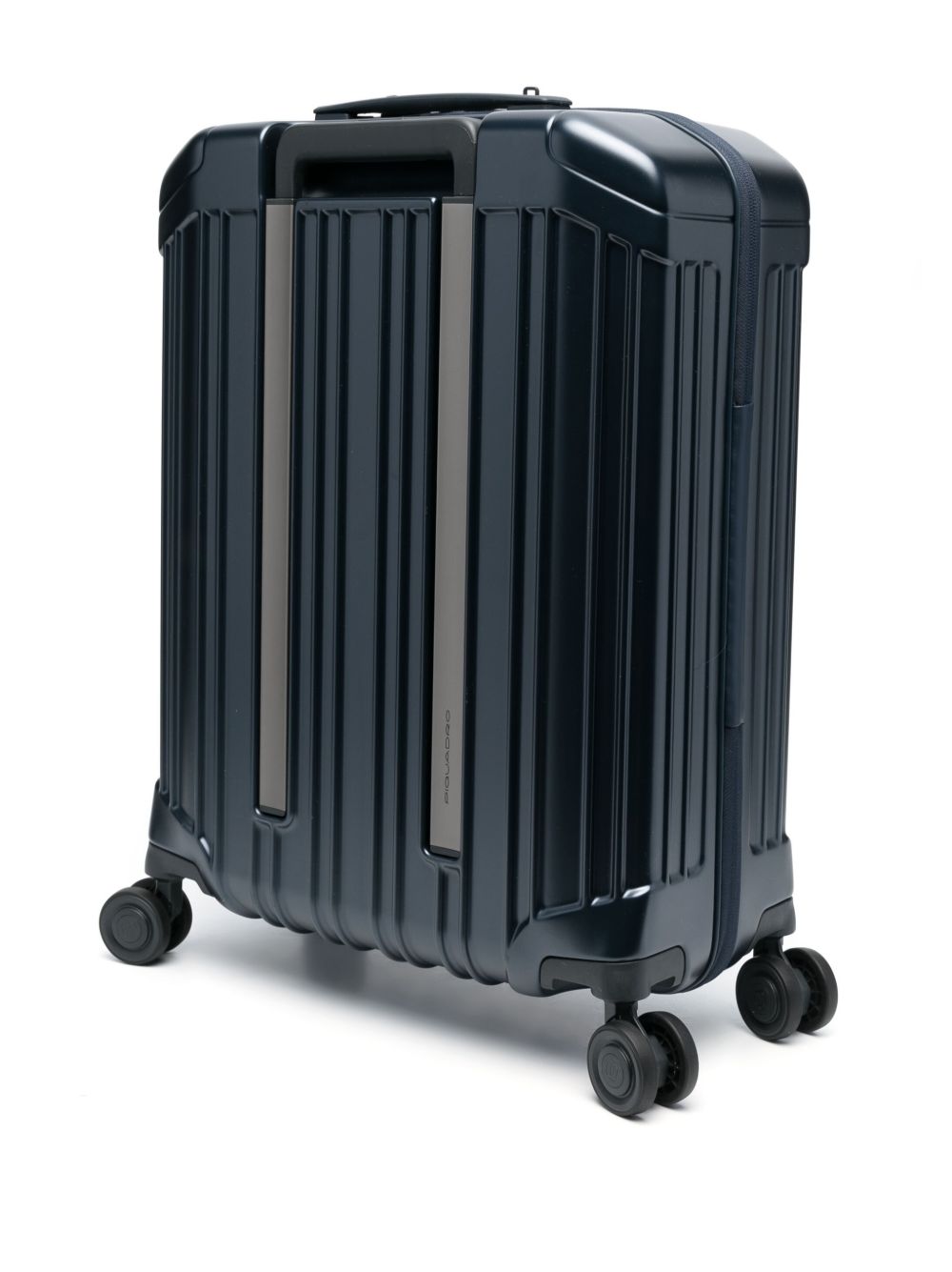 Trolley Piquadro da cabina con quattro ruote, progettato per offrire resistenza e praticità durante il viaggio.