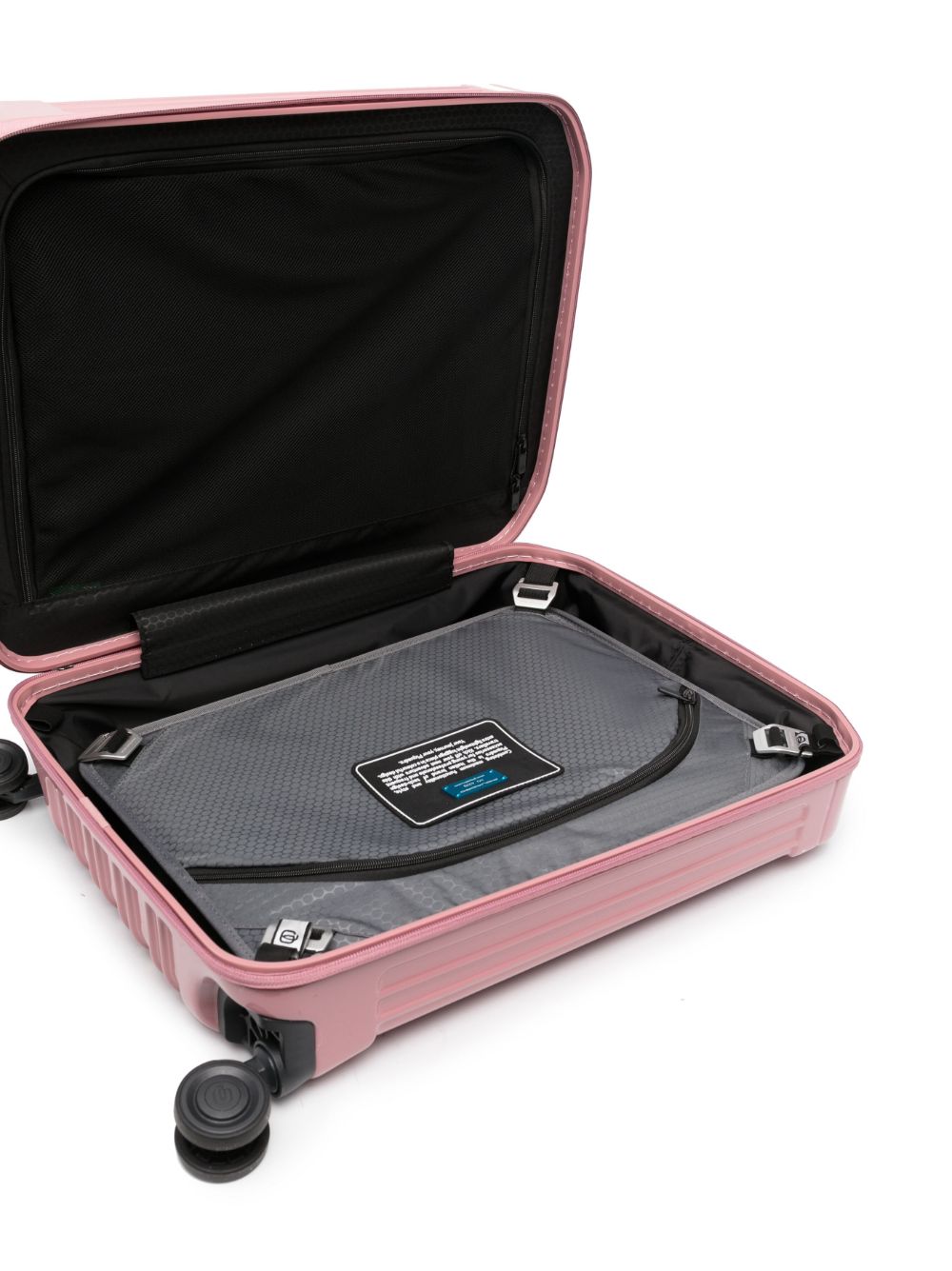 Trolley cabina Piquadro con quattro ruote, caratterizzato da una tonalità rosa distintiva.