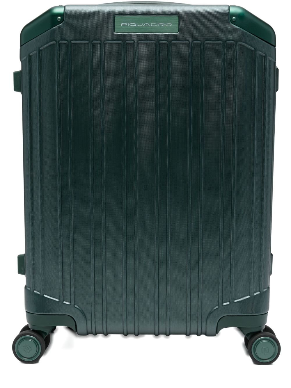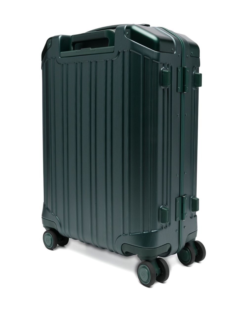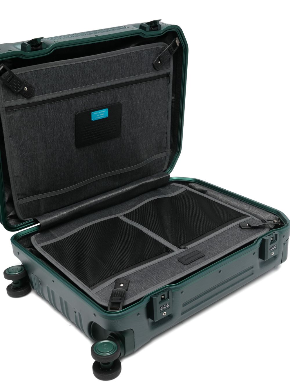 design rigido e ultra slim, realizzato in policarbonato, dettagli in pelle, quattro ruote, manici a scomparsa, chiusura doppia con lucchetto TSA, trolley system a due aste, tasca portaoggetti fissa, cinghie fermabiti, 40 x 55 x 20 (cm), 37 Lt, 3.466 g