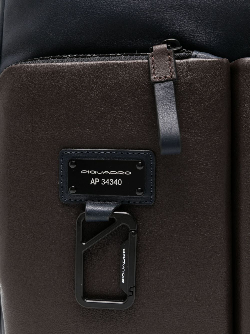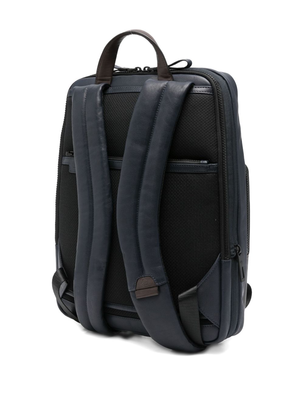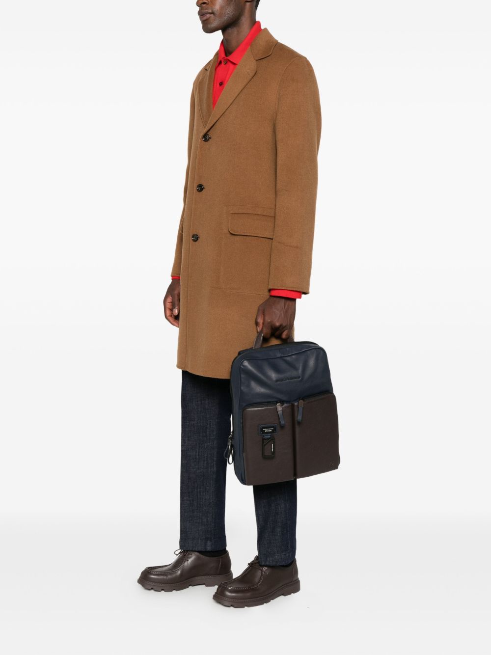 realizzato in vera pelle, manico singolo, chiusura superiore con doppio cursore, due tasche frontali, spallacci regolabili, placca logata davanti, lunghezza 29 cm, altezza 38 cm, profondità 8 cm