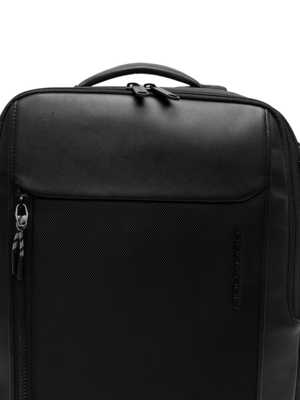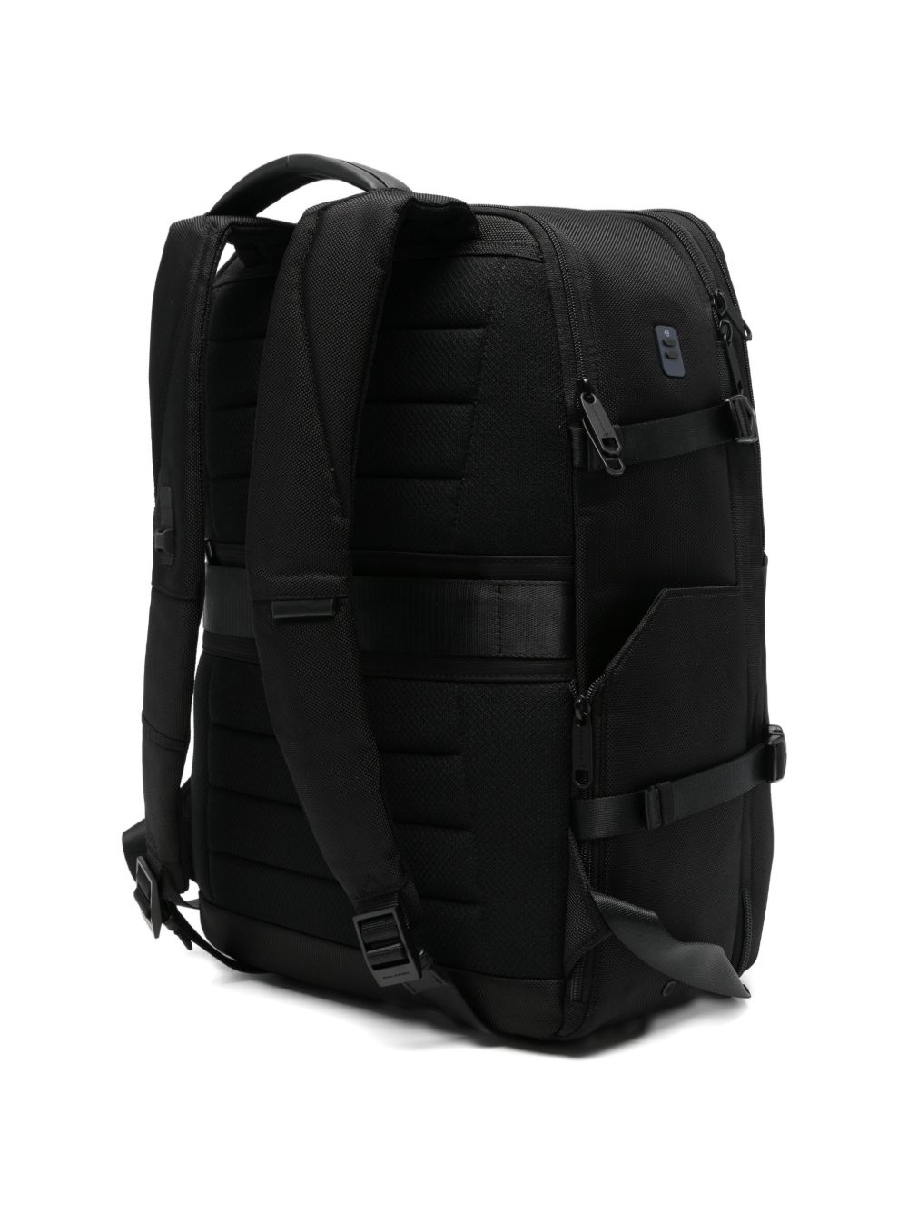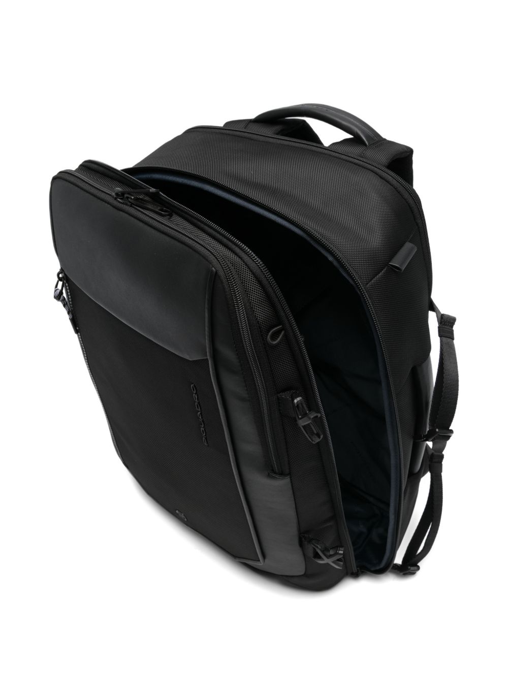 Realizzato in pelle e tessuto riciclato, logo davanti, scomparti con chiusura a zip, spallacci regolabili, manico fisso, aggancio per trolley, porta occhiali, aggancio per torcia, tasca per power bank AirPods e per ricarica ad induzione, attacco per caschetto da bici, scomparto per pc fino a 15"6', fodera interna in poliestere con cinghie ferma abiti, 31,50 litri, 34 x 45 x 20 (cm)
