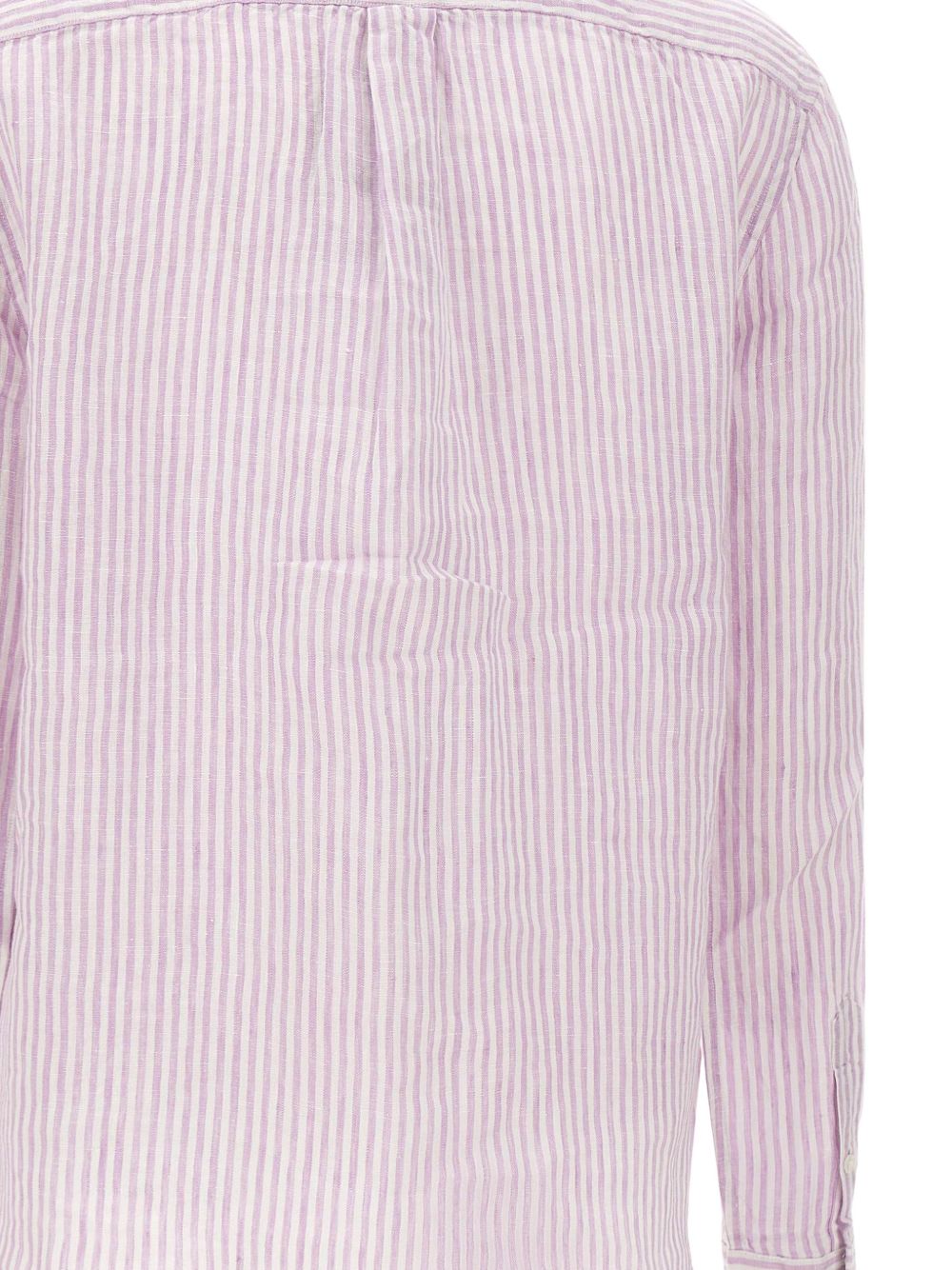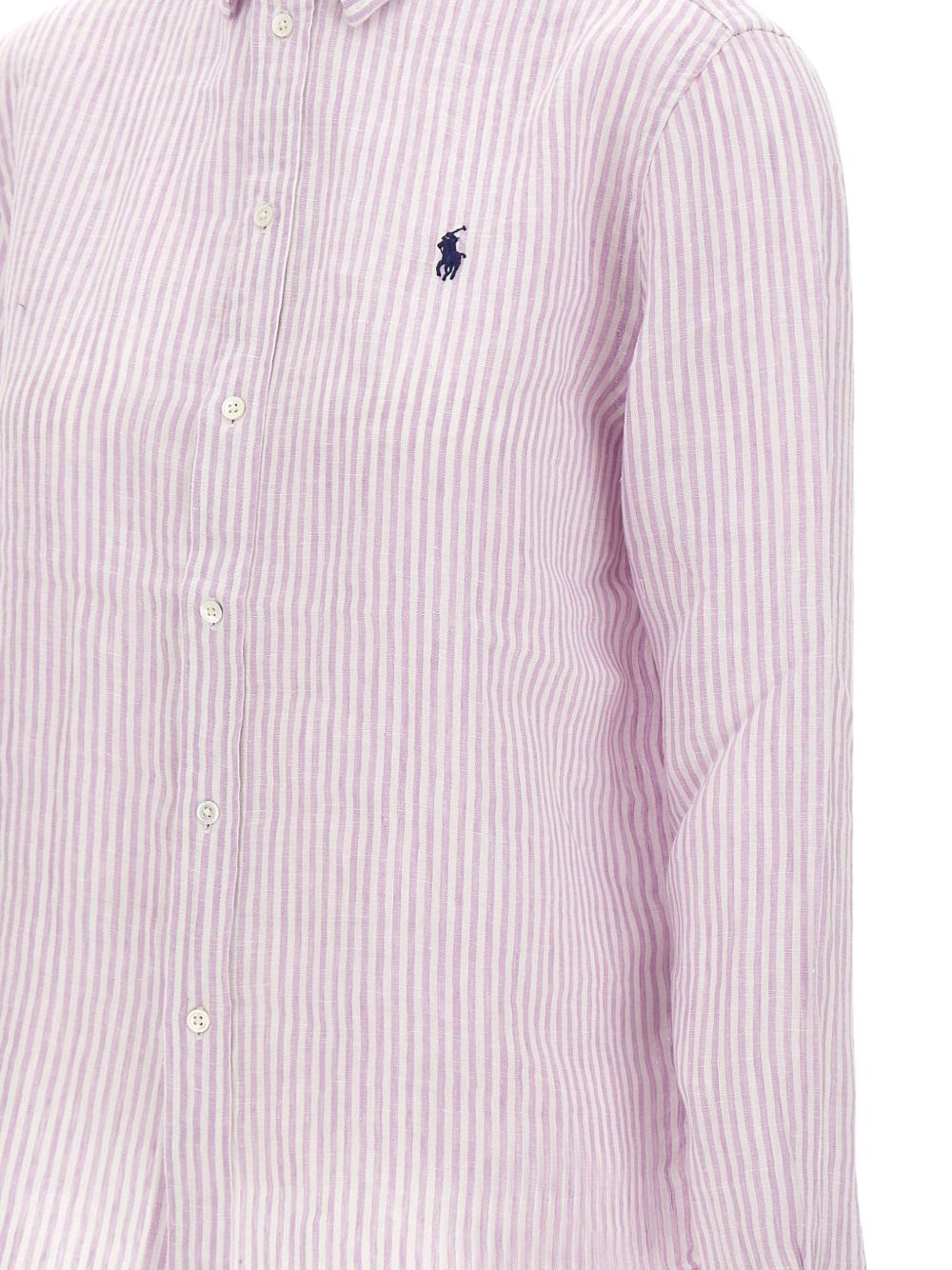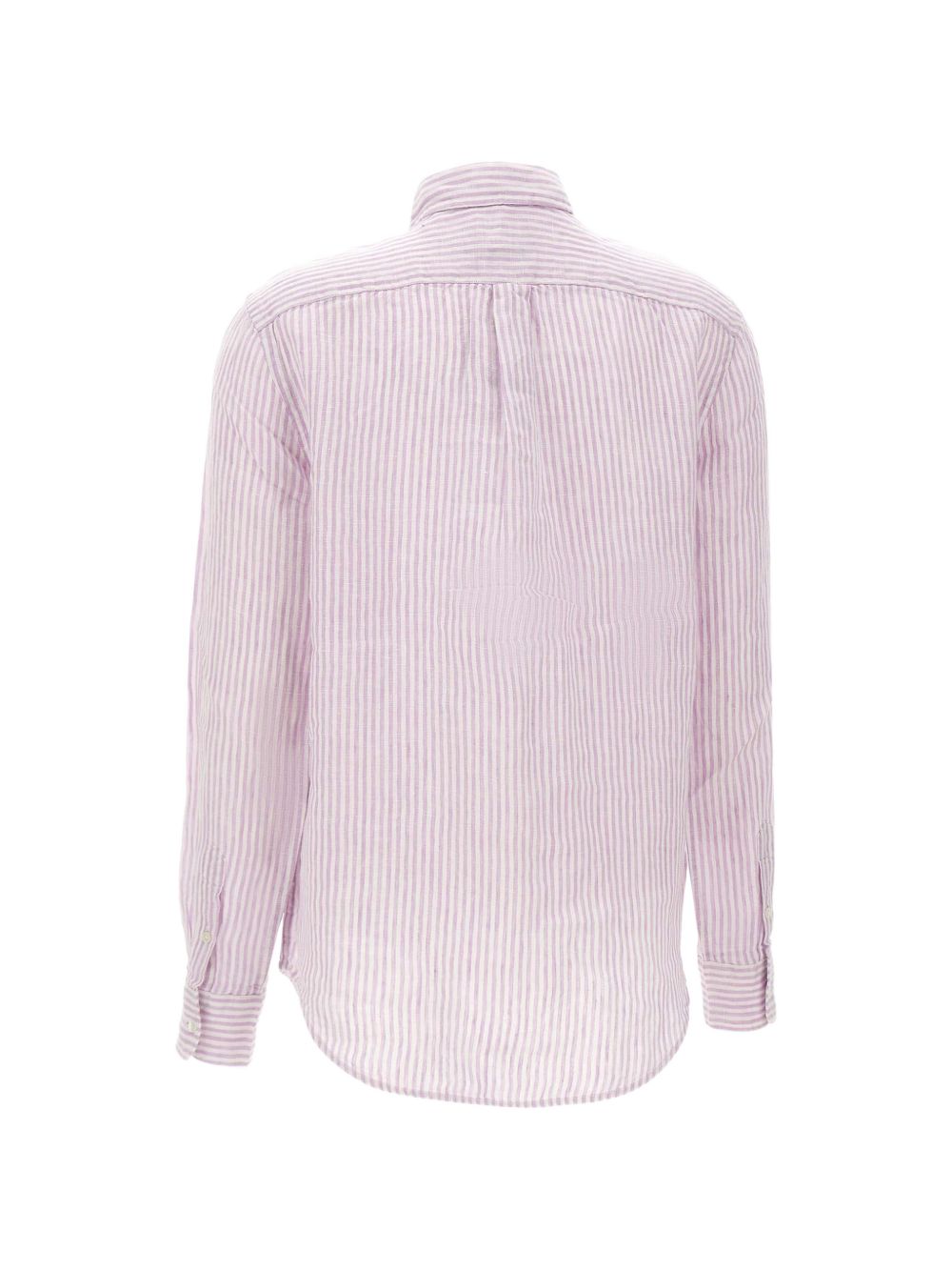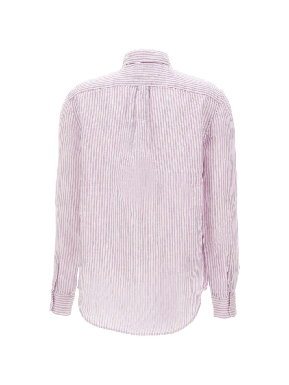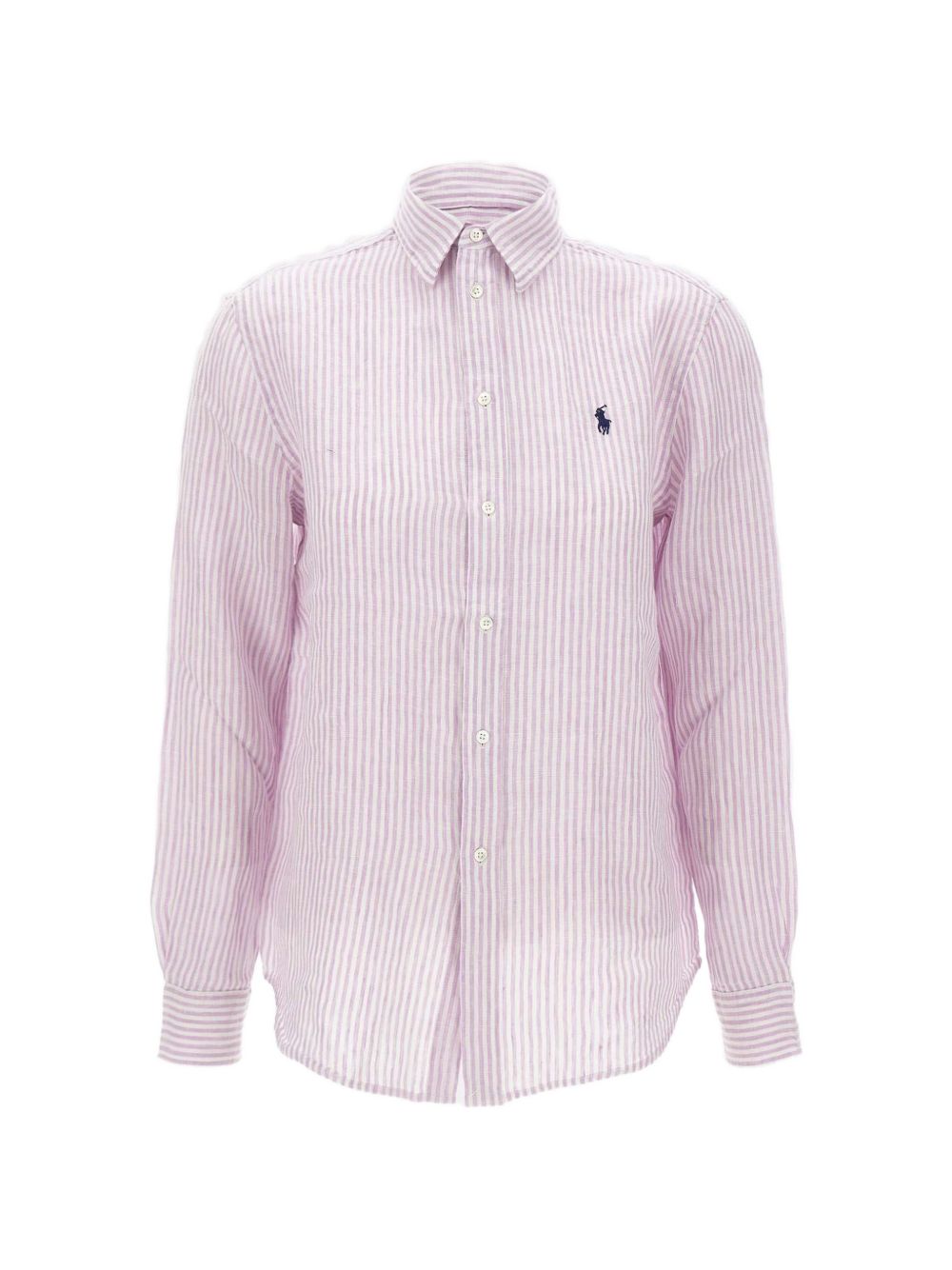 design con righe verticali, colletto classico, logo ricamato sul petto, orlo curvo