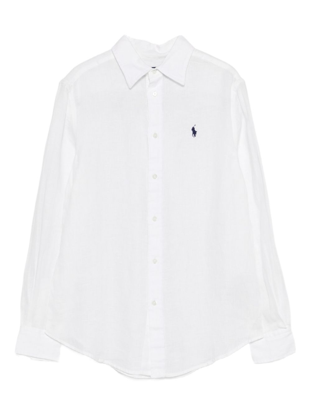 Camicia Polo Ralph Lauren da donna in lino bianco, caratterizzata da linea classica e tessuto naturale traspirante.