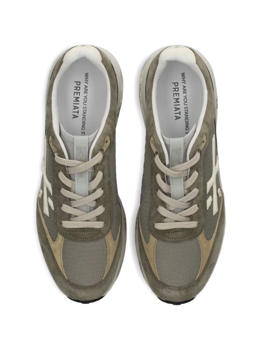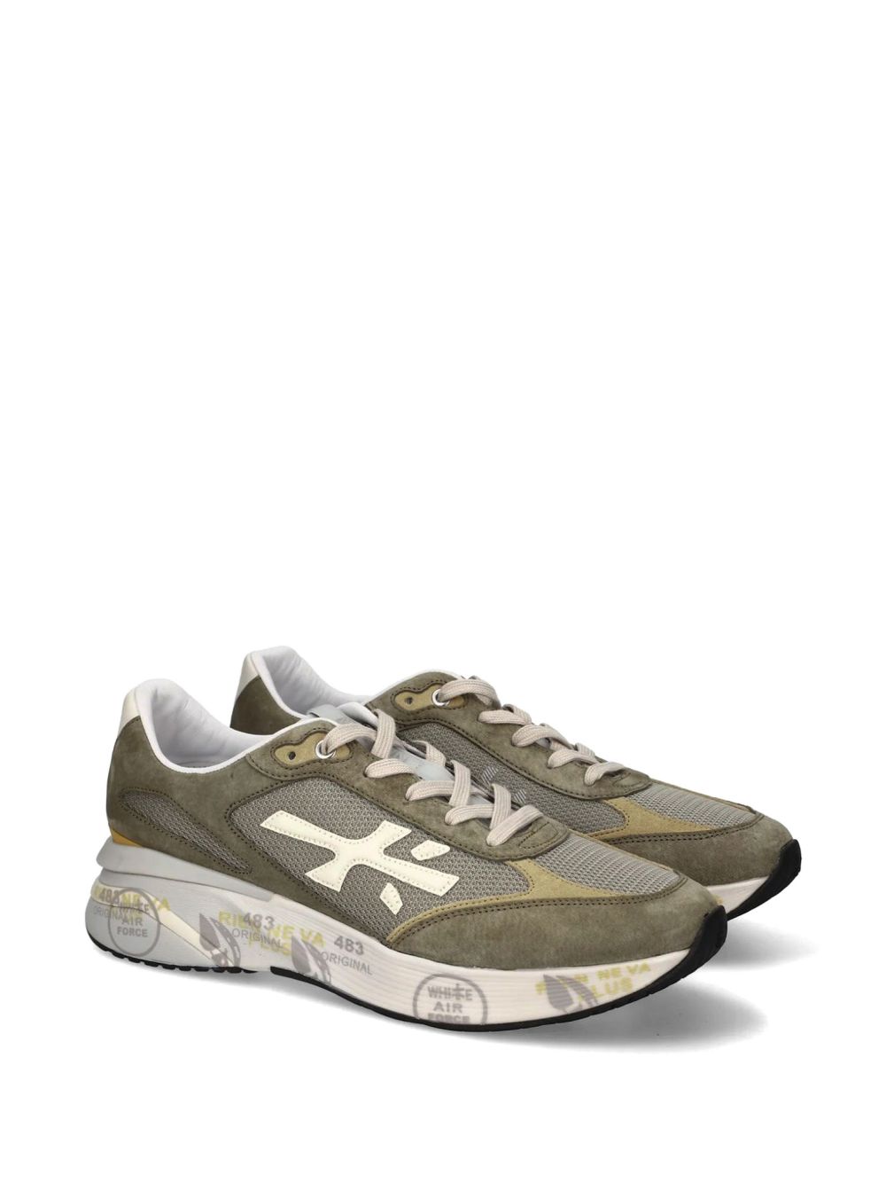 Sneakers Premiata Prime modello running in colore verde militare, caratterizzate da design sportivo e contemporaneo.